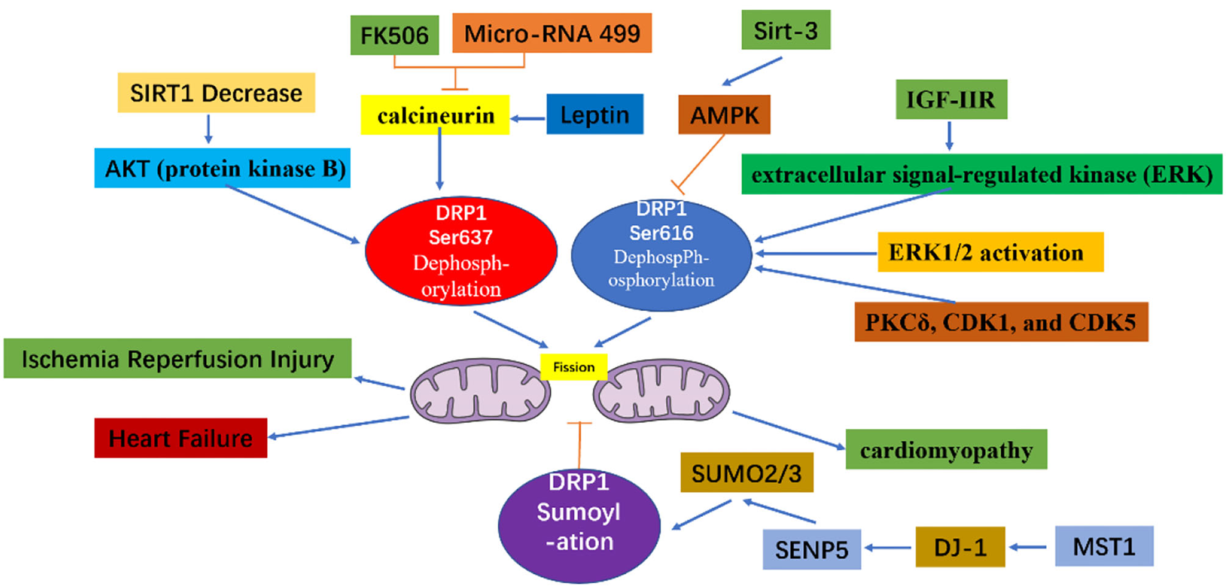 Cell signal transduction pathway acting on DRP1 and its role in heart disease.