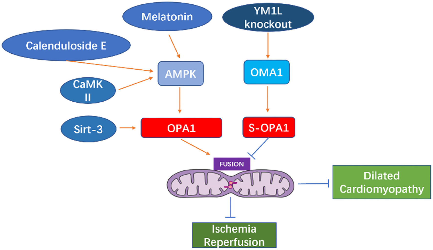 Melatonin can activate OPA1-mediated mitochondrial autophagy and fusion in an AMPK-dependent manner, thereby reducing cardiac ischemia-reperfusion injury (110). Coenzyme Q10 can induce the AMPK-YAP-OPA1 cell signal transduction pathway, thus, improving mitochondrial function and reducing the degree of arteriosclerosis (114). Calenduloside E can reduce cardiac ischemia-reperfusion injury by regulating OPA1-related mitochondrial fusion mediated by AMPK activation (115). In the cardiomyocyte model of ischemia-reperfusion injury, increased expression of OPA1 can reduce the oxidative stress of cells through the Ca+2/calmodulin-dependent protein kinase II (CaMKII signaling) pathway (116).