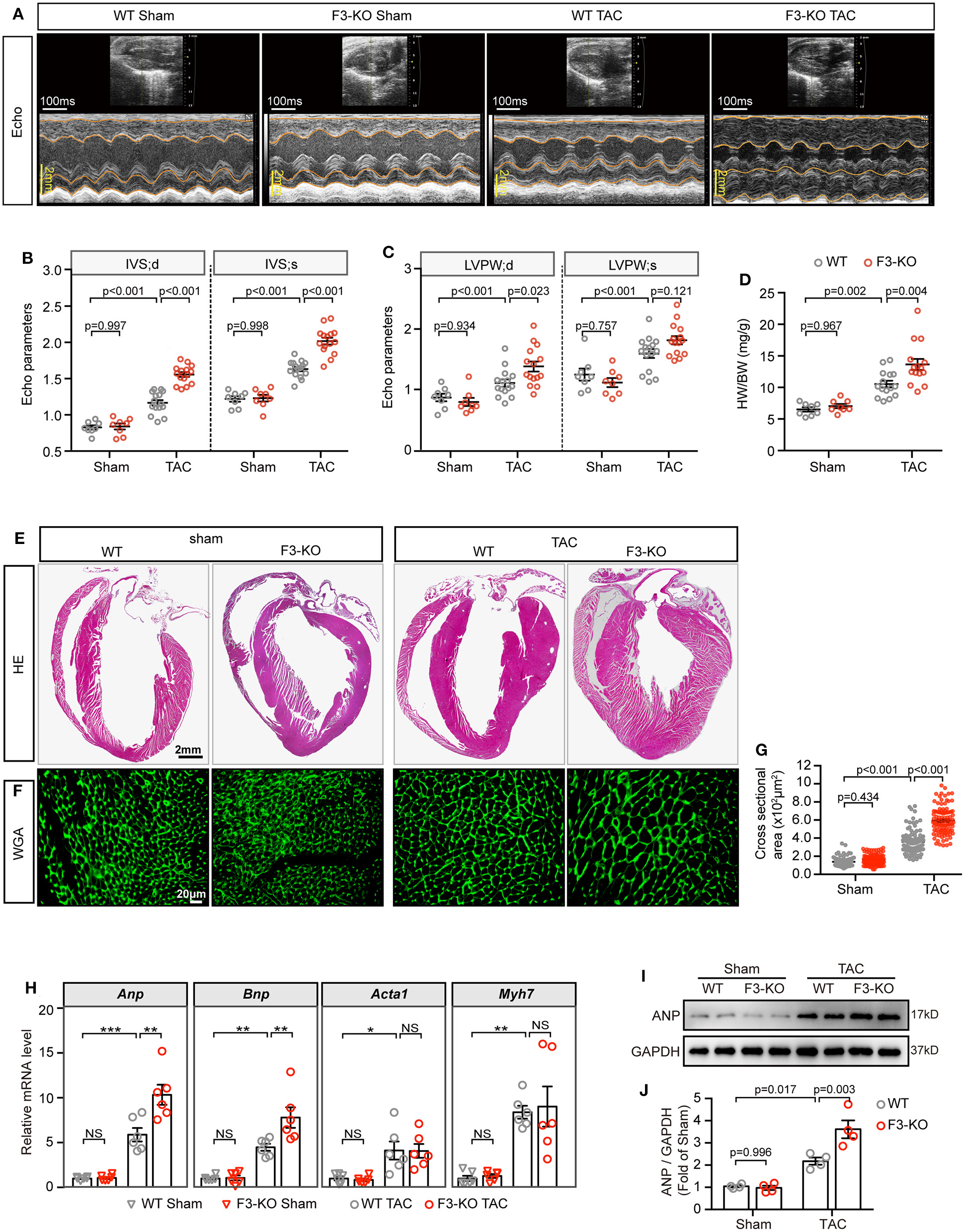Figure 2. Deficiency of FABP3 aggravates TAC-induced cardiac hypertrophy. (A) Representative echo images of the WT and F3-KO mice at 4 weeks after TAC or sham operation. (B) Quantification results for the interventricular septum (IVS) in (A). (C) Quantification results for the left ventricular posterior wall thickness (LVPW) in (A). (D) The ratio of heart weight to body weight from sham or TAC-operated WT or F3-KO mice. (E) Images of H&E stained longitudinal sections of the indicated hearts. (F) Heart sections stained with WGA to compare the size of the cardiomyocyte area. (G) Quantification results in (F); a total of 100 cells/group were calculated. (H) qPCR assays compared the mRNA expression of Anp, Bnp, Acta1, and Myh7 at 4 weeks after sham or TAC operation. NS, not significant, *p < 0.05, **p < 0.01, ***p < 0.001. (I) Representative western blot images of ANP in the indicated groups. (J) Quantification results of (I). [B–D, n = 8, 8, 15, 15, respectively; H, n = 6; J, n = 4; (B–D,G,H,J) Tukey's post-hoc test].
