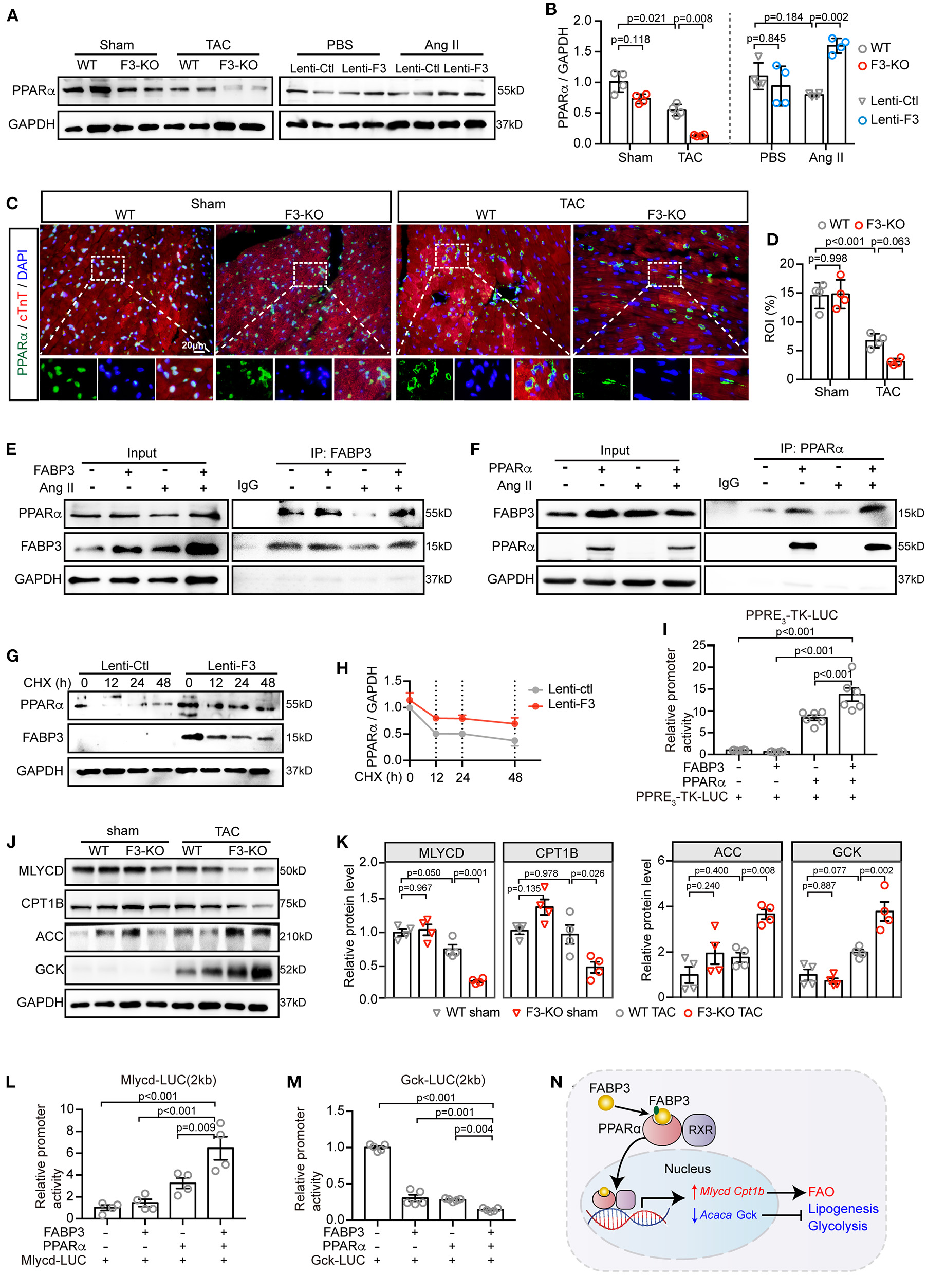 Figure 6. FABP3 mediates metabolic reprogramming by directly interacting with PPARα, preventing its degradation and enhancing its transactivation. (A) Representative western blot images of PPARα from TAC-operated WT and F3-KO hearts, or from NRVMs transfected with Fabp3 or its control virus with or without Ang II treatment. (B) Quantification of (A). (C) Immunofluorescence double-staining of PPARα (green) and cTnT (red) in WT and F3-KO hearts, with or without TAC surgery. (Bottom) Higher magnification of dashed rectangle in the upper panel. (D) Quantification results in (C). (E) NRVMs with Fabp3 overexpression were treated with or without Ang II for 24 h and then co-immunoprecipitated (co-IP) with FABP3. Western blotting assay was conducted with indicated antibodies. (F) NRVMs with Pparα overexpression were treated with or without Ang II for 24 h and then co-immunoprecipitated (co-IP) with PPARα. (G) NRVMs transfected with Lenti-F3 or Lenti-Ctl were treated with CHX for 0, 12, 24, or 48 h and the protein expression of PPARα was measured by western blotting. (H) Quantification of PPARα intensities by normalizing to those of GAPDH in (G). (I) HEK 293T cells were transfected with a PPRE-driven luciferase reporter (PPRE3-TK-LUC) and PPARα or FABP3 for 24 h. Relative activation of PPRE3-TK-LUC was measured by normalizing its luminescence value to the renilla activity. (J) Representative western blot images of MLYCD, CPT1B, ACC, and GCK in WT and F3-KO mice after sham or TAC operation. (K) The quantification results of (J). (L,M) HEK 293T cells were transfected with a Mlycd-promoter luciferase reporter (Mlycd-LUC, L) or a Gck-promoter luciferase reporter (Gck-Luc, M), PPARα, or FABP3 for 24 h. The relative expression of the Mlycd-promoter and Gck-promoter was measured by normalizing their luminescence value to the corresponding renilla luminescence value. (N) The schematic diagram shows FABP3 binds to PPARα and increases its transcriptional activity on Mlycd and Cpt1b while repressing Acaca and Gck to participate in cardiac FAO/glycolysis shift. [B, n = 4, Games–Howell post-hoc test; D, n = 4, Tukey's post-hoc test; H, n = 2; I, n = 6, Dunnett's post-hoc test; K, n = 4, Tukey's post-hoc test; L, n = 4; M, n = 5; (L,M) Dunnett's post-hoc test].