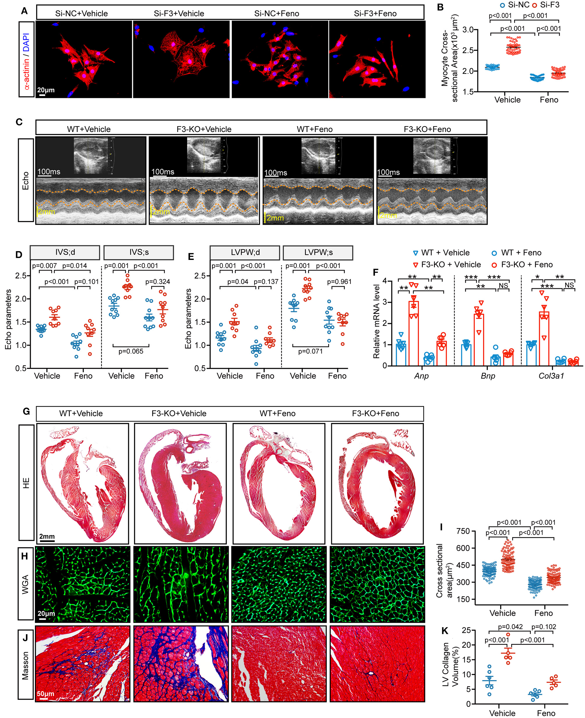 Figure 7. Fenofibrate represses FABP3-null induced cardiac hypertrophy in vivo and in vitro. (A) NRVMs were treated with siRNA targeted Fabp3 (Si-F3) or its negative control before fenofibrate or vehicle treatment. Immunofluorescence staining of α-actinin used to compare the myocyte area. (B) Quantification of (A). (C) Representative echo images in WT or F3-KO mice with or without fenofibrate treatment (Feno or Vehicle, respectively) at 4 weeks after TAC surgery. (D) Quantification of IVS in (C). (E) Quantification of LVPW in (C). (F) Relative mRNA levels of Anp, Bnp, and Col3a1, as determined by qPCR in the indicated groups. NS, not significant, *p < 0.05, **p < 0.01, ***p < 0.001. (G) Images of H&E-stained longitudinal heart sections from WT or F3-KO mice with or without fenofibrate treatment. (H) Representative immunofluorescence images of WGA staining from WT or F3-KO mice with or without fenofibrate treatment. (I) Quantification of the cardiomyocyte cross-sectional area in (I) (n = 100). (J) Masson staining to determine cardiac fibrosis in the aforementioned groups. (K) Quantification of collagen volume in (L). [D, E, n = 10, 9, 10, 9, respectively; (B, D-IVS; s): Games–Howell post-hoc test; (D-IVS; d, E): Tukey's post-hoc test; F, n = 6, (F-Anp, F-Col3a1, and I): Games–Howell post-hoc test; K, n = 6, 5, 6, 5; (F-Bnp, and K): Tukey's post-hoc test].