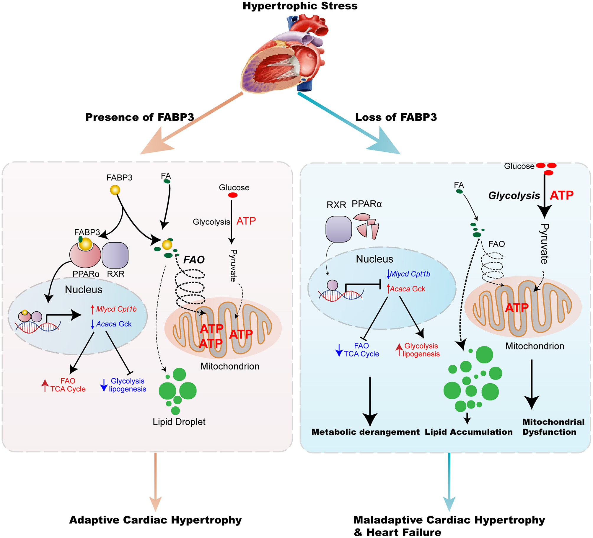 Accordingly, the present study aimed to determine the metabolic effects of FABP3 on transverse aortic constriction (TAC)-induced cardiac hypertrophy and heart failure using genetic mutant Fabp3-null mice. Our findings indicate that Fabp3-defect exacerbates cardiac hypertrophy and heart dysfunction, resulting in defective FAO, and increased glycolysis by impairing the PPARα signaling pathway. Furthermore, the agonist of PPARα, fenofibrate, attenuated TAC-induced cardiac hypertrophy in both wild-type (WT) and Fabp3-null mice. Collectively, this study for the first time demonstrates the indispensable role of FABP3 on metabolic homeostasis and the advance of hypertrophy and heart failure.