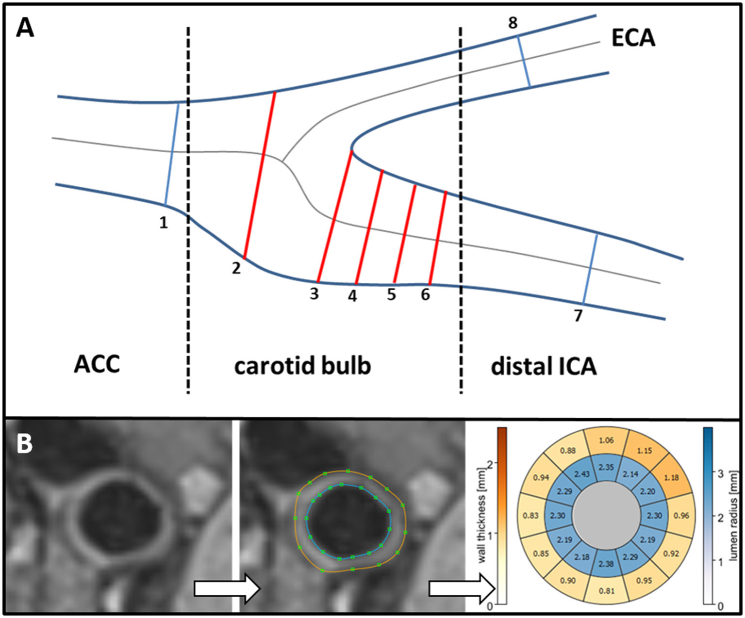 Figure 1. (A) Standardized position of the eight analysis planes. Planes 2–6 represent the carotid bulb. (B) T1-weighted cross-section illustrating carotid wall thickness (left). Manual segmentation of outer (brown line) and inner (blue line) vessel wall border in the cross-section (middle). Quantitative results of vessel lumen (inner ring labeled blue) and of wall thickness (outer ring labeled yellow to red) are displayed in a bulls-eye-plot comprising 12 evenly distributed wall segments (right). CCA, common carotid artery; ICA, internal carotid artery; ECA, external carotid artery.