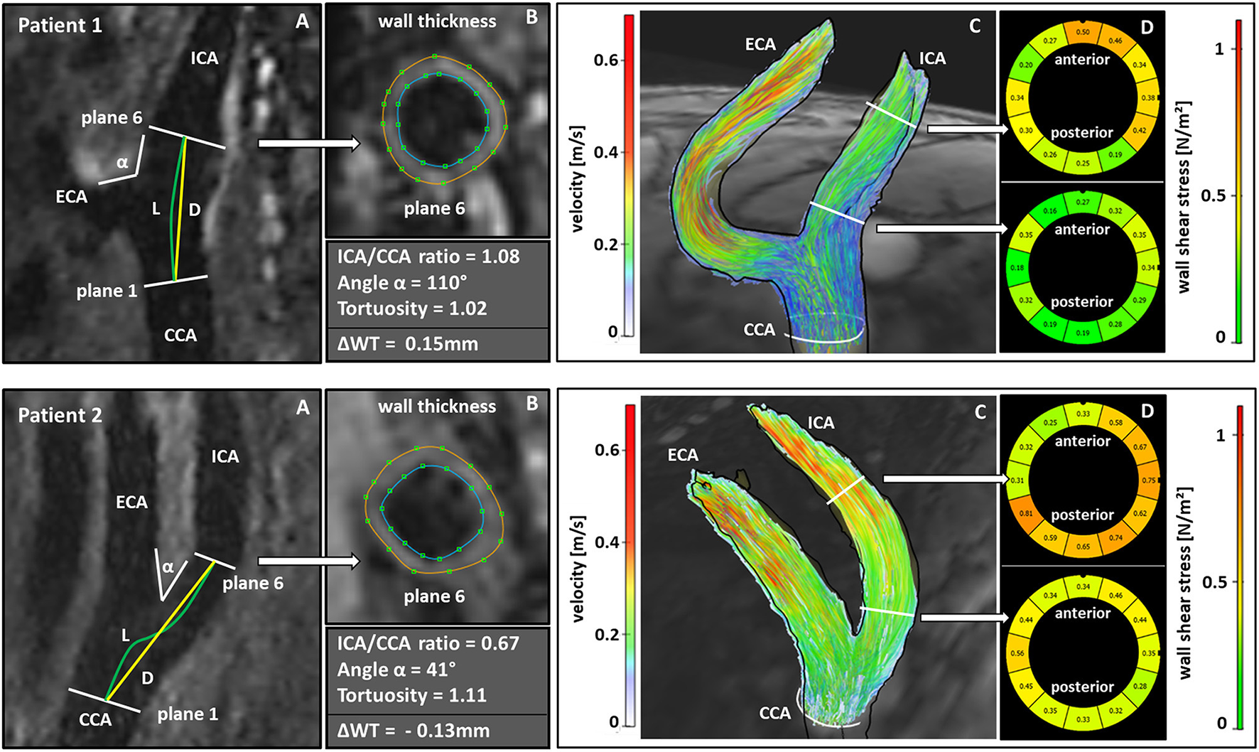 Figure 2. Comparison of geometric and hemodynamic properties associated with wall thickness progression (Patient 1) or plaque regression (Patient 2) during follow-up. Calculation of the ICA/CCA-ratio from the maximum diameters in plane 6 and plane1; L and D indicate the CCA-ICA distances along the lumen center (L) and the direct connection (D) for calculation of carotid tortuosity, α indicates bifurcation angle (A). Manual segmentation of wall thickness in the cross section corresponding to the white arrow (B). Streamlines represent absolute blood flow velocities in m/s derived from 4D flow MRI. (C). Wall shear stress analysis in the cross section corresponding to the white arrow (D). (Patient 1) showed an increase in wall thickness of 0.15 mm while (Patient 2) showed a decrease of wall thickness of 0.13 mm during follow-up. (Patient 1) had a higher ICA/CCA-ratio, a larger bifurcation angle, a lower tortuosity and showed lower wall shear stress values in the carotid bulb compared to (Patient 2) and compared to the values in the distal ICA. CCA, common carotid artery; ICA, internal carotid artery; ECA, external carotid artery; ΔWT, difference in wall thickness between follow-up and baseline examination.
