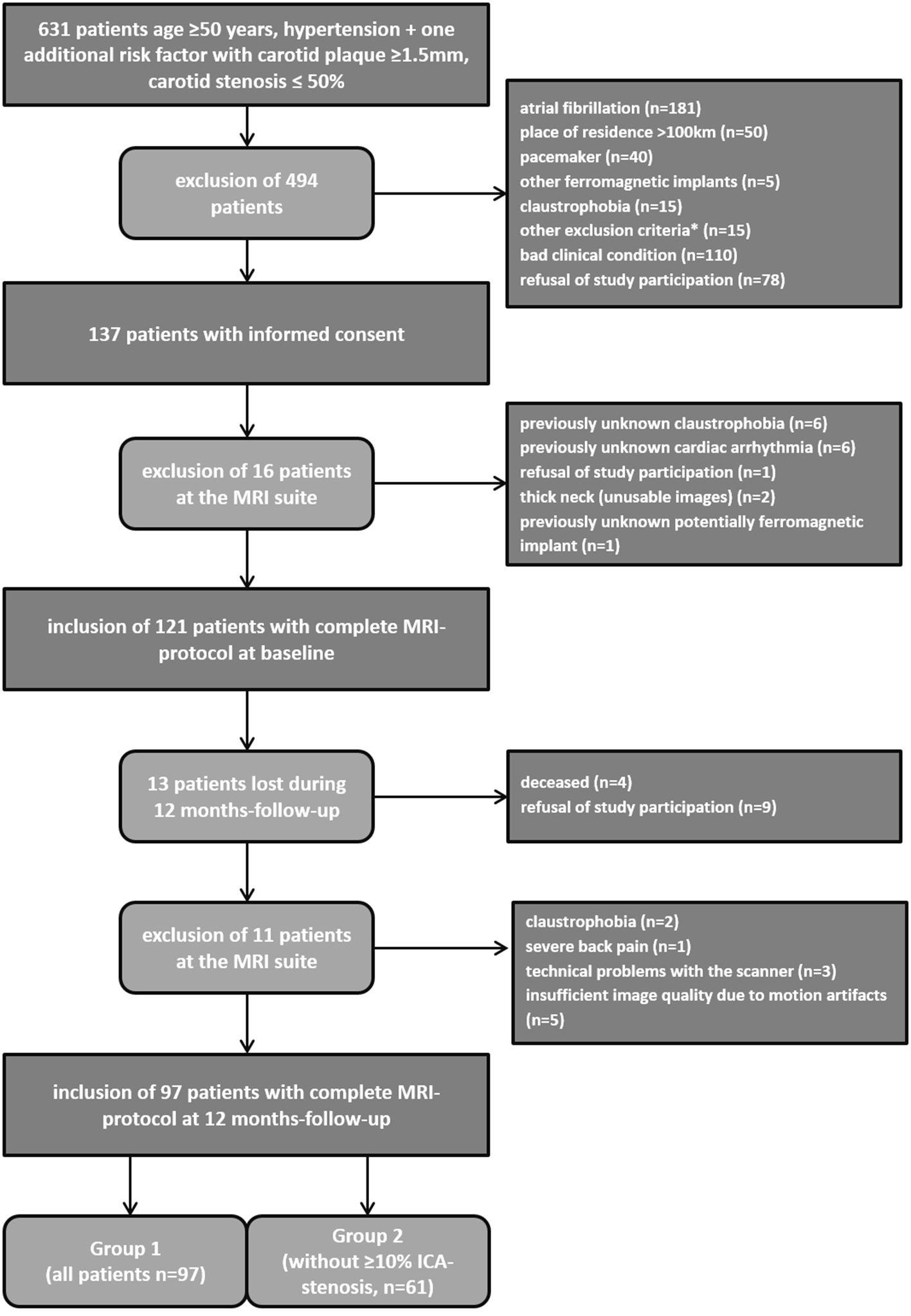 Exclusion criteria were: contraindications to 3 Tesla MRI such as ferromagnetic implants, claustrophobia, poor clinical condition [modified ranking scale (mRS) > 3 at baseline], atrial fibrillation or other relevant cardiac arrhythmias interfering with the ECG-trigger in MRI, ICA-stenosis >50% (NASCET criteria) (15), life expectancy <2 years, pregnancy, distance to the place of residence >100 km (to reduce the risk of loss to follow-up) and refusal of study participation (9).