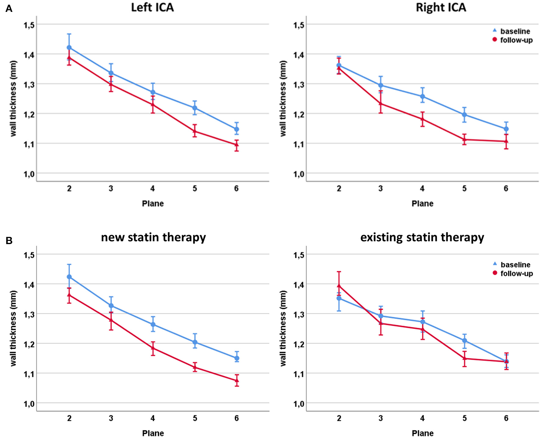 Figure 4. Changes of wall thickness during follow-up of the left and right carotid bulb (A). Changes of wall thickness during follow-up of the carotid bulb in patients receiving de novo statin therapy (left) and patients with an existing statin therapy at study inclusion (right) (B).