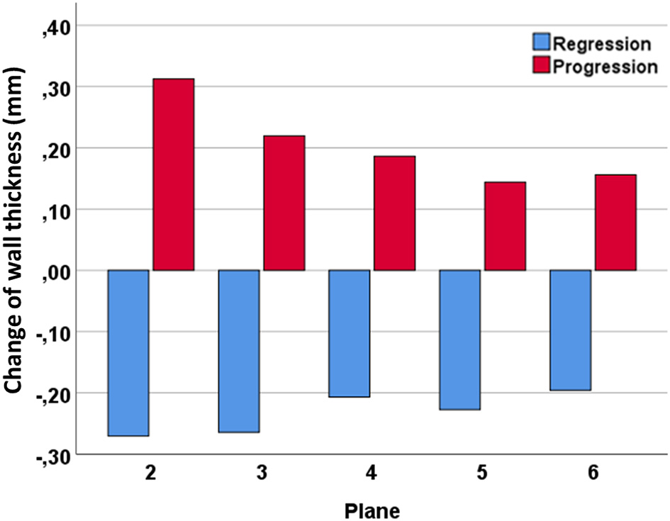 Figure 5 illustrates the distribution of progression and regression of wall thickness indicating that the largest changes occurred in the proximal bulb.