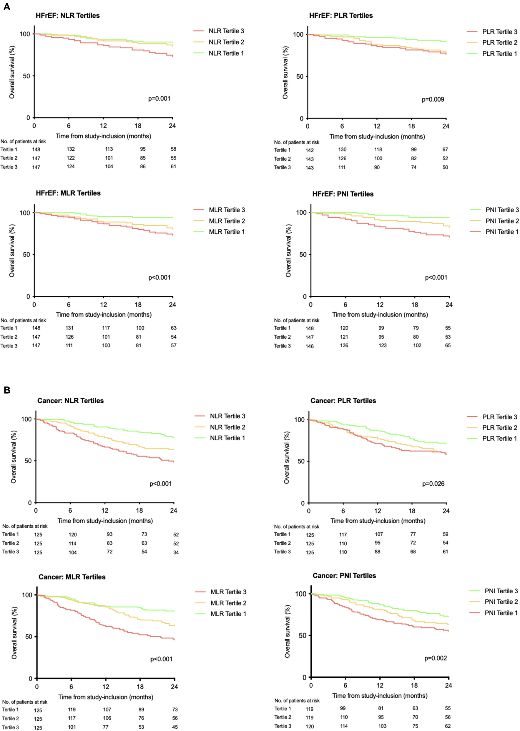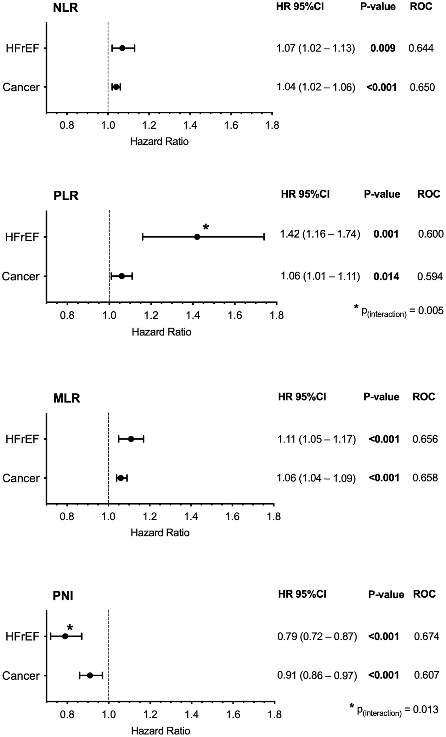 Methods: HFrEF and cancer patients were prospectively enrolled. The neutrophil-to-lymphocyte-ratio (NLR), the monocyte-to-lymphocyte-ratio (MLR), the platelet-to-lymphocyte-ratio (PLR), and the prognostic nutritional index (PNI) at index day were calculated. Association of scores with disease severity and impact on overall survival was determined. Interaction analysis was performed for the different populations.
