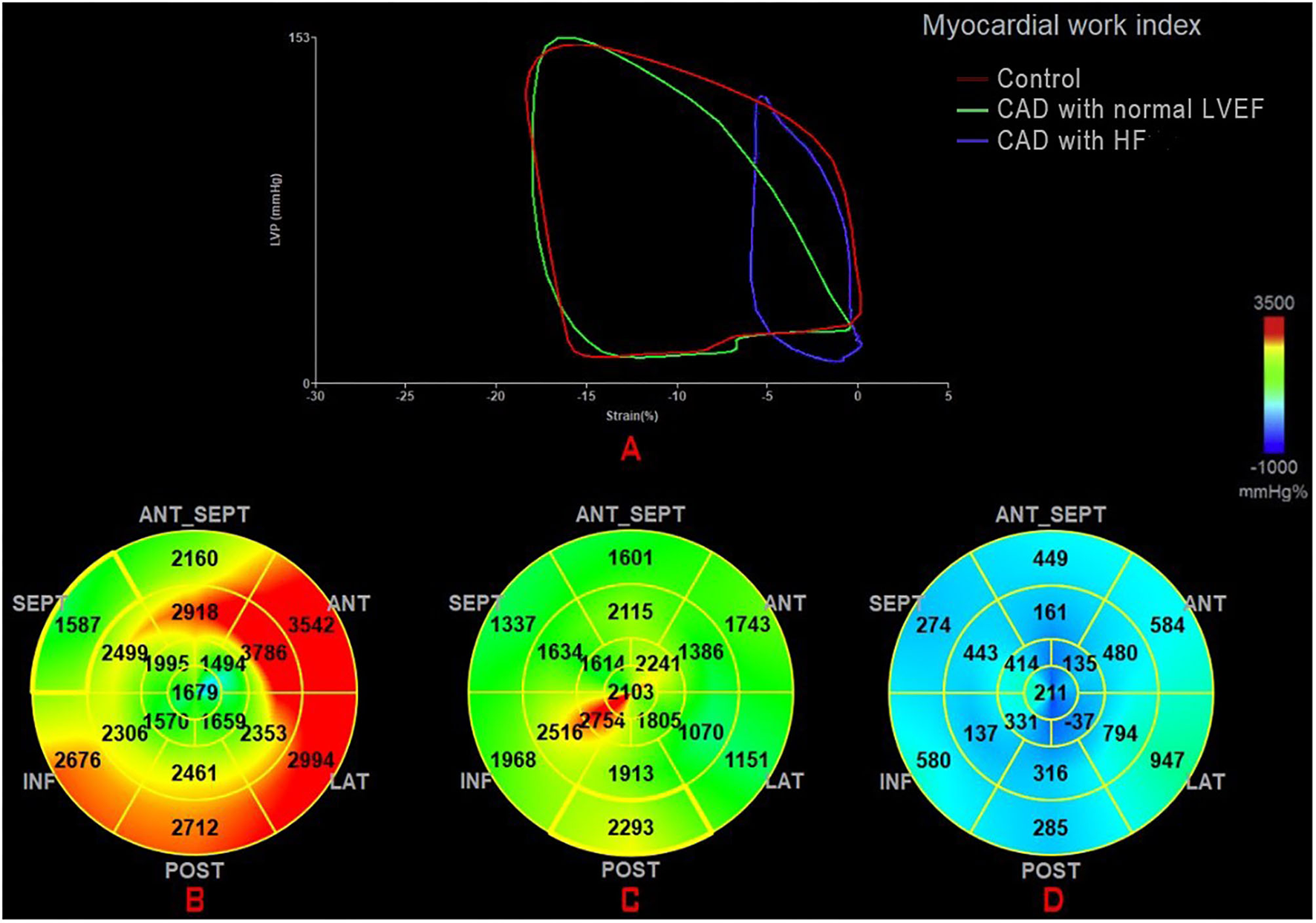 (A) Mean PSL in the healthy individual (green) and a CAD patient with normal LVEF (red) and a CAD patient with HF (blue). Seventeen segment bull'seye representation of the MW index (GWI): (B) in a healthy individual; (C) in a CAD patient with normal LVEF; and (D) in a CAD patient with HF. CAD, coronary artery disease; GWI, global work index; HF, heart failure; MW, myocardial work; PSL, pressure-strain loop.