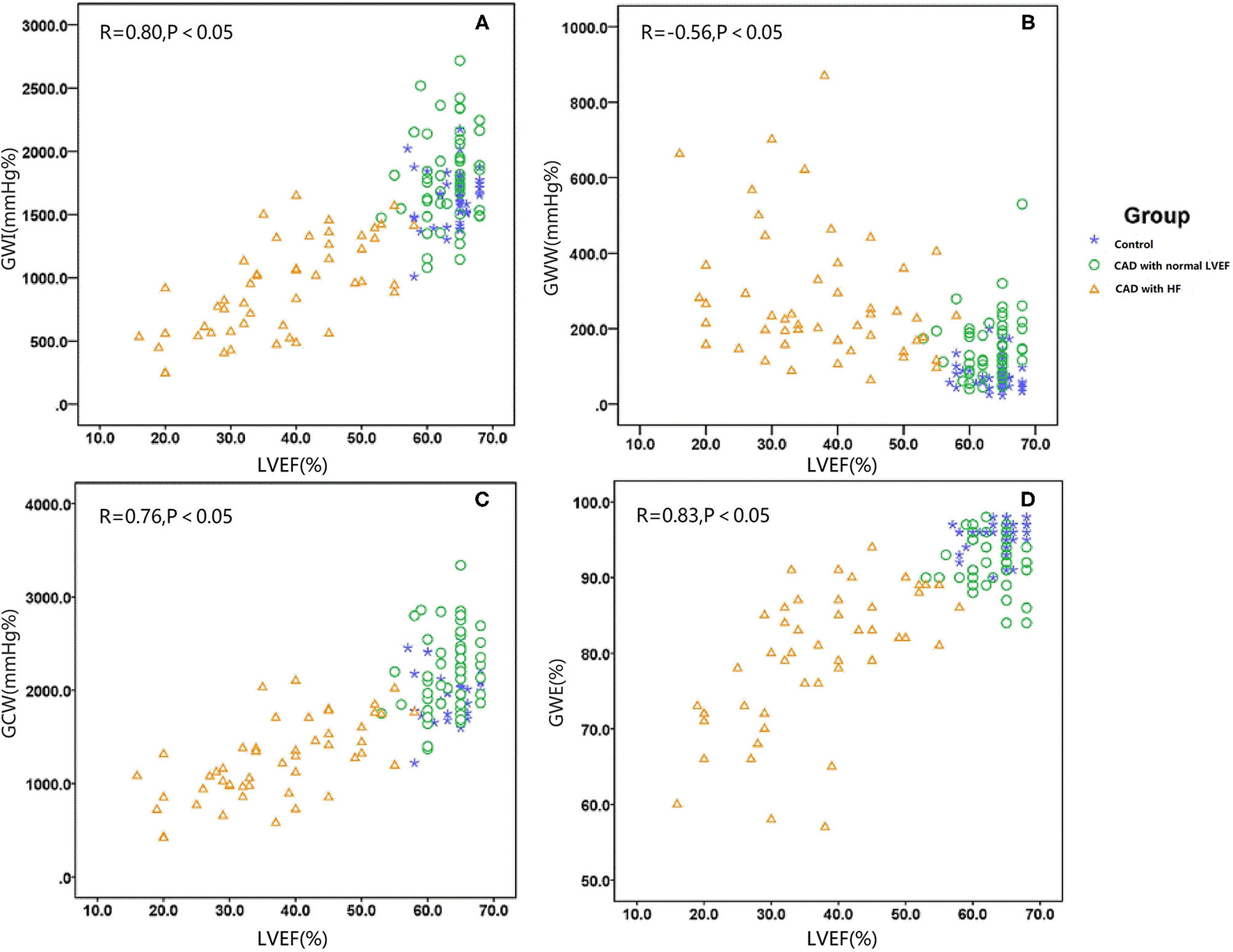 Results: Univariate and multivariate analyses showed that MW indices were strongly correlated with LVEF. The global work index (GWI) was increased in the CAD with normal LVEF subgroup with HTN vs. controls (1,922.3 ± 393.1 vs. 1,639.7 ± 204.6 mmHg%, p < 0.05) and decreased in CAD patients with HF (no HTN: 940.9 ± 380.6 vs. 1,639.7 ± 204.6 mmHg%, p < 0.05; HTN: 857.3 ± 369.3 vs. 1,639.7 ± 204.6 mmHg%, p < 0.05). Global waste work was increased in all CAD subgroups vs. controls. Global constructive work had the same tendency as GWI in patients with CAD. Global MW efficiency was decreased in all patients with CAD.