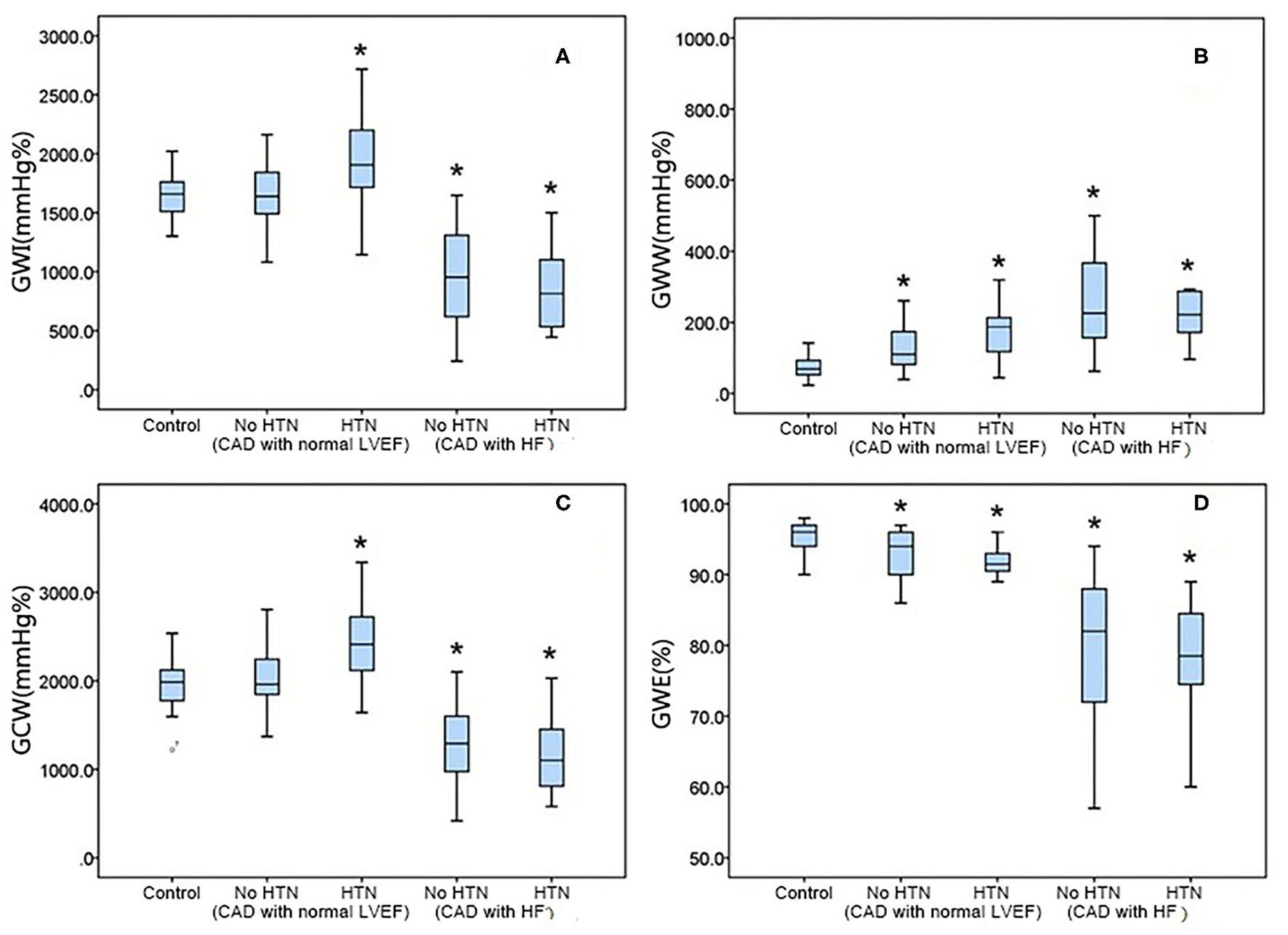 Graph showing the median as well as 25th and 75th percentiles of the GWI (A), GWW (B), GCW (C), and GWW (D). *P < 0.05, significantly different compared with the controls. GCW, global constructive work; GWE, global myocardial work efficiency; GWI, global work index; GWW, global waste work; HF, heart failure; HTN, hypertension.
