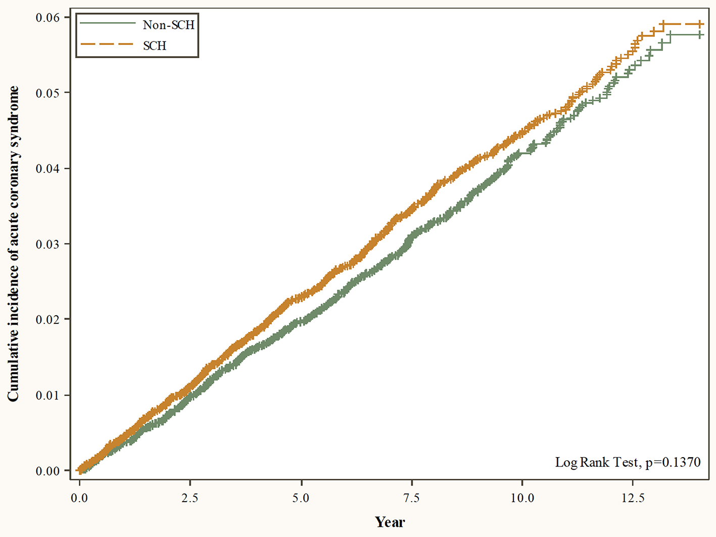 Table 3 compares the incidence of ACS between patients with and without SCH in different stratifications. It was found that there were no significant differences for any stratifications between non-SCH and SCH patients.