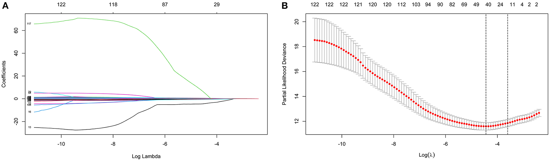 Identification of variables using the least absolute shrinkage and selection operator (LASSO) regression algorithm. The numbers above the graph represent the number of variables involved in the LASSO model. (A) LASSO coefficient profiles of the 122 variables. (B) Identification of the optimal penalization coefficient λ in the LASSO model. The partial likelihood deviance is plotted against log (λ), where λ is the tuning parameter. Red dots indicate average deviance values for each model with a given λ, and partial likelihood deviance values are shown, with error bars representing s.e. The dotted vertical lines are plotted at the value selected using the 10-fold cross-validation and 1 – s.e. criteria.