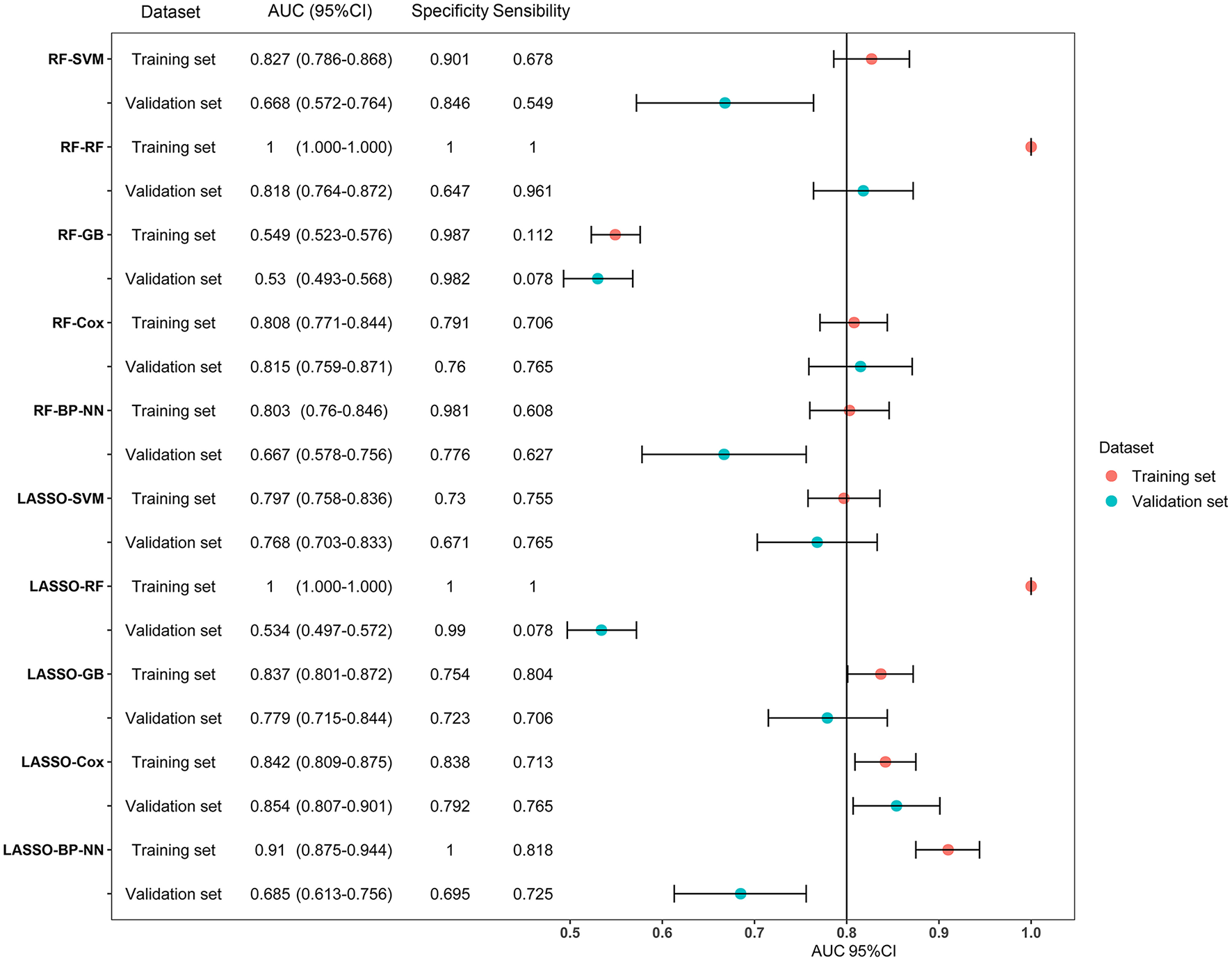 Forest plot of area under the curves (AUC) of the training and validation datasets for the ten models. AUCs are shown with 95 percent confidence intervals for training set and validation set in each algorithm group. RF, random forest; SVM, support vector machine; GB, gradient boosting; BP-NN, backpropagation neural network; LASSO, least absolute shrinkage and selection operator.
