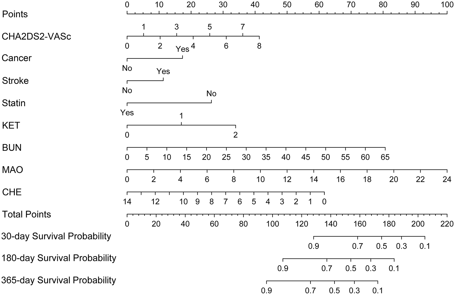 Nomogram for predicting 30-, 180-, and 365-day survival probabilities for AF patients. To calculate patient survival probabilities, obtain points for each covariate value by dropping a vertical line from the points axis to the value of each covariate, calculate the total points obtained from all eight covariate values, and then drop a vertical line from the total points axis to locate the associated 30-, 180-, or 365-day survival probability. KET, urine ketone body; BUN, blood urea nitrogen; CHE, cholinesterase; MAO, monoamine oxidase.