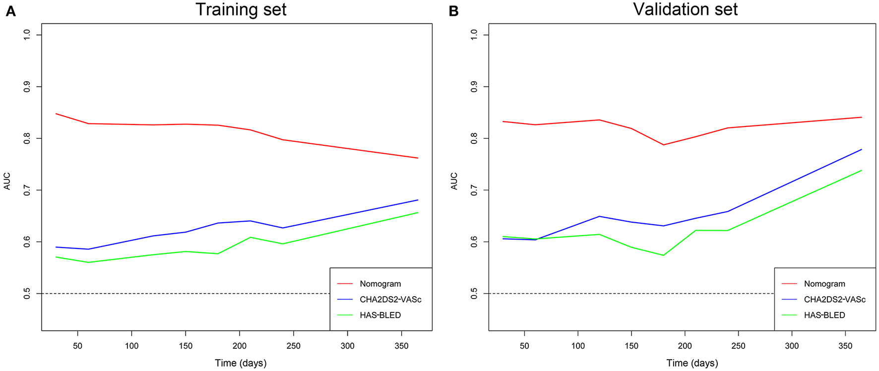 Comparison of the Nomogram With CHA2DS2-VASc and HAS-BLED Models for Predictive Performance