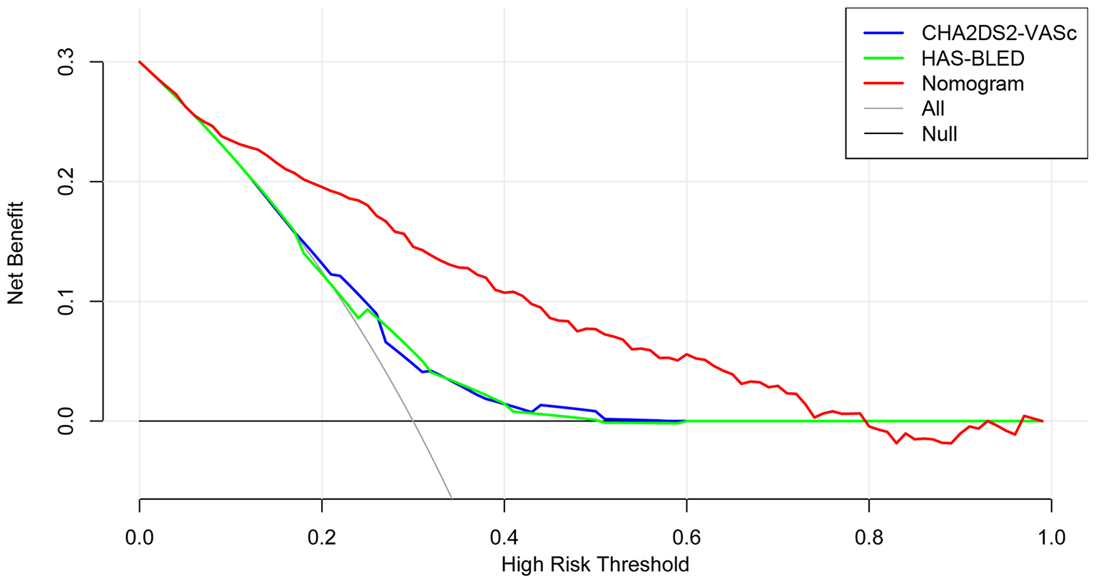 The time-dependent ROCs of the training and validation sets (Figure 5) based on the nomogram were higher than those based on the traditional CHA2DS2-VASc and HAS-BLED models. These results indicate that our nomogram has greater potential for accurately predicting prognosis compared to the traditional models. DCA was performed to compare the net benefit of the nomogram with that of the traditional CHA2DS2-VASc and HAS-BLED scores. Compared to the CHA2DS2-VASc and HAS-BLED scores, the curve of our nomogram showed larger net benefit (Figure 6). We further converted the nomogram to a web calculator for the clinician's convenience (https://afnom.shinyapps.io/DynNomapp/).