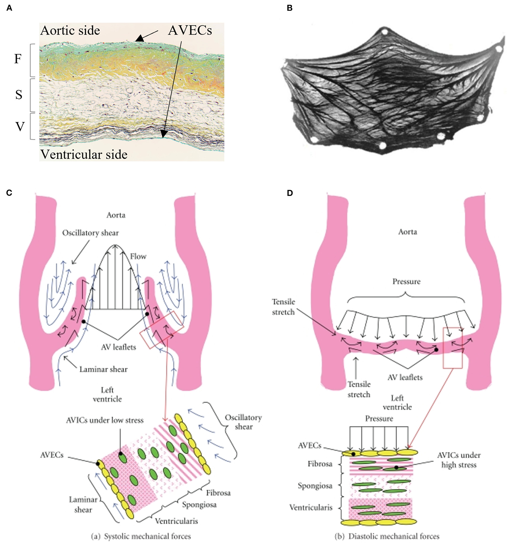 Microscopic and macroscopic overview of aortic valve tissue structure: (A) histological section of the aortic valve leaflet showing three layers: fibrosa (F), spongiosa (S), and ventricularis (V) covered by valvular interstitial cells (VICs) and valvular endothelial cells (VlvECs). (B) excised view of the aortic valve leaflet demonstrating fiber structure. Schematic of stress experienced by aortic valve leaflets and valvular cells during (C) systole, and (D) diastole. (A) is from Fishbein et al. (B) is from Driessen et al. (C,D) are from Balachandran et al. with permission.