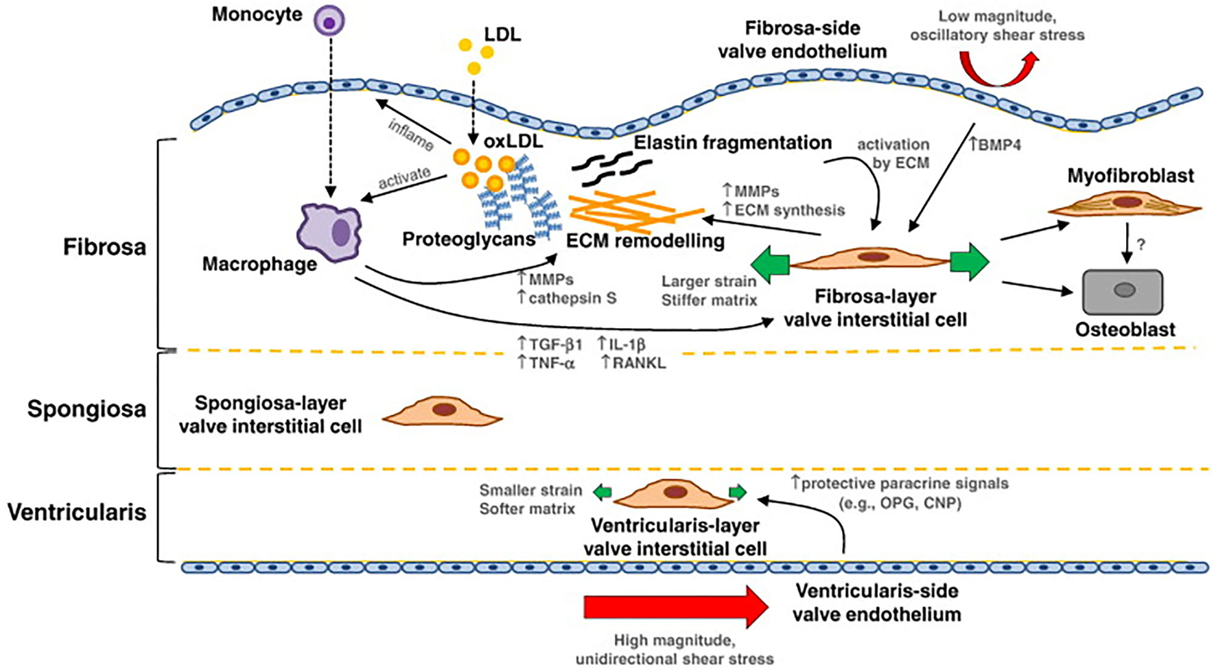 Summary of mechanotransduction and pathway of valvular calcification: in the fibrosa layer, the oxidated LDL (oxLDL) can inflame the endothelial cells, bind to monocytes, and activate macrophages. Activated macrophages mediate extracellular matrix (ECM) remodeling and molecular signaling that can potentiate valvular interstitial cell (VIC) pathological differentiation to myofibroblast and osteoblast cells. The ECM further affects VIC activation and differentiation; activated VICs synthesize and remodel the ECM, and produce cytokines, like TGF-β1. Interstitial and endothelial cells on each layer of the tissue exhibit a different phenotype. On the ventricular side, endothelial cells experience high magnitude and unidirectional shear stress, which may inhibit pathological differentiation of the local VICs. Image is from Yip et al. with permission.