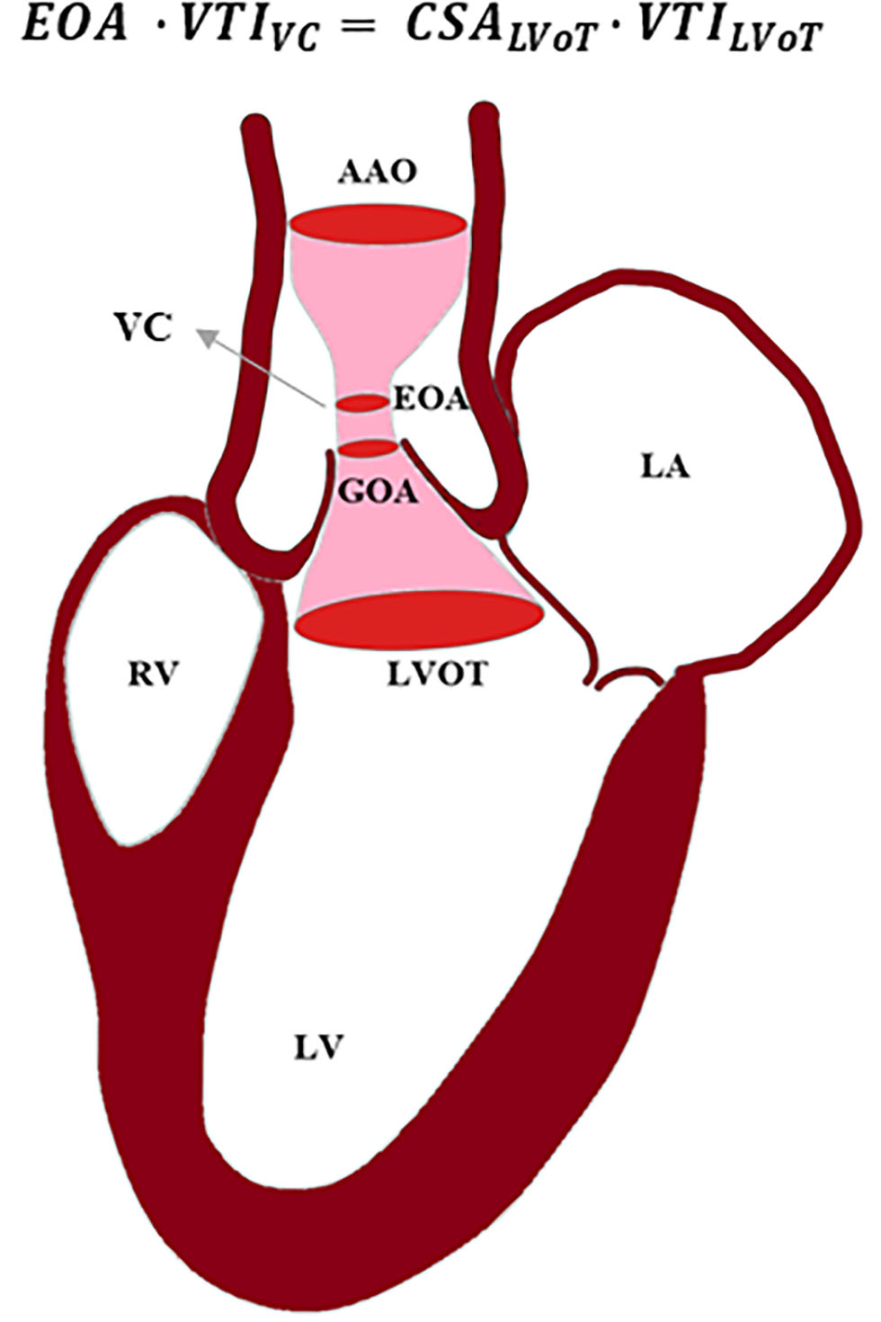 Schematic of blood passing through a stenosed aortic valve. Using continuity equation, the effective orifice area (EOA) can be calculated based on velocity time integral (VTI) at vena contracta (VC), cross-sectional area (CSA) of left ventricle outflow tract (LVOT), and VTI at LVOT. AAO, ascending aorta; LA, left atrium; LV, left ventricle; RV, right ventricle; GOA, geometric orifice area.