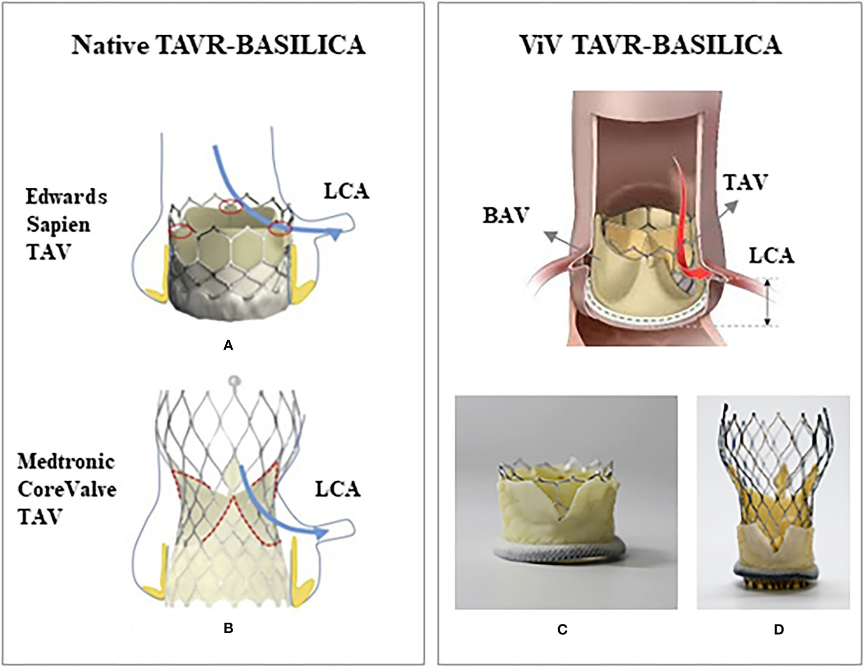 Schematic of a native TAVR-BASILICA and a valve-in-valve TAVR-BASILICA: (A) a Edwards Sapien 3 transcatheter aortic valve (TAV) and (B) a Medtronic CoreValve Evolut R TAV replaced in a native aortic valve. (C) An Edwards Sapien 3 TAV and (D) a Medtronic CoreValve Evolut R TAV replaced in a bioprosthetic aortic valve (BAV). Red and blue arrows show the location of the lacerated leaflet (native or bioprosthetic) relative to the left coronary artery (LCA). (A,B) are from Krishnaswamy et al. (C,D) are from Khodaee et al. with permission.