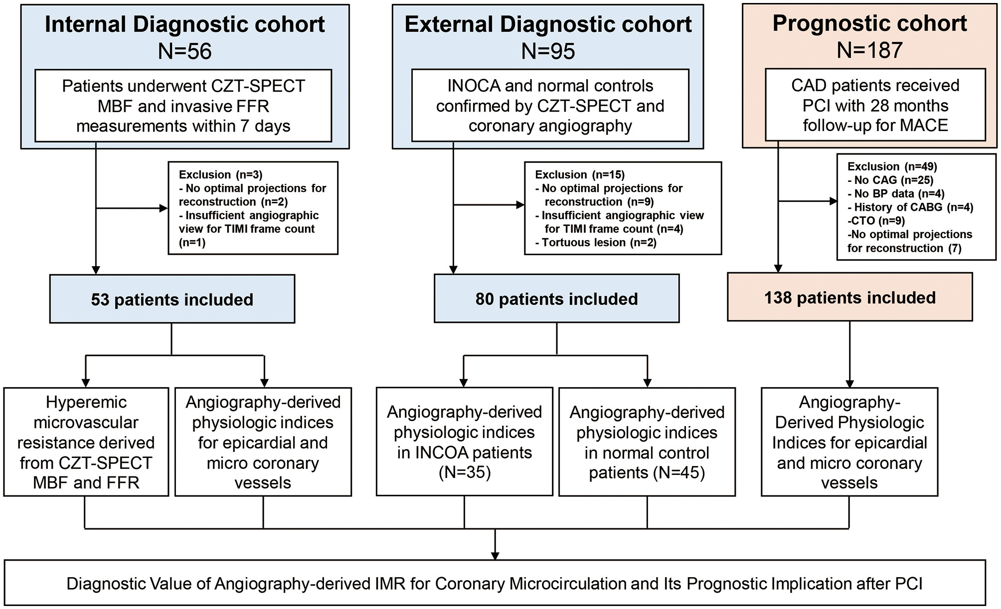 Study flow. The study population was composed of internal and external diagnostic cohorts and prognostic cohort. Internal diagnostic cohort was used to evaluate the correlation between angio-IMR and HMR; external diagnostic cohort was used to evaluate the diagnostic performance of angio-IMR to diagnose INOCA. Prognostic cohort was used to evaluate the prognostic implication of angio-IMR in CAD patients after PCI. Angio-IMR, angiography-derived index of microcirculatory resistance; CAD, coronary artery disease; HMR, hyperemic microcirculatory resistance; INOCA, ischemia and no obstructive coronary artery disease; PCI, percutaneous coronary intervention.