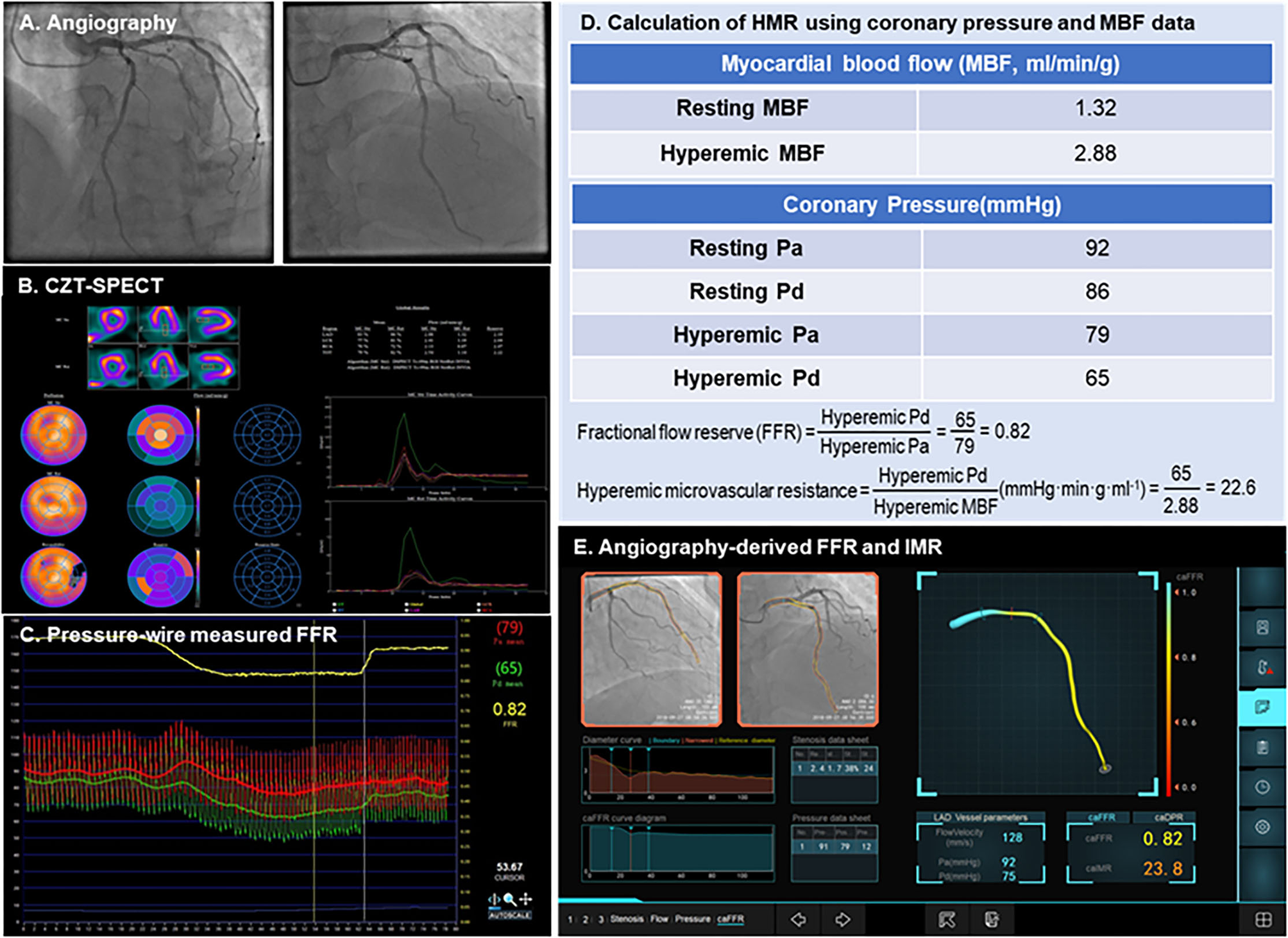Case examples of angiography-derived physiologic indices. A representative case of CZT-SPECT MBF, pressure wire FFR, and angio-IMR measurements, as well as how HMR are calculated from MBF and coronary pressure, are shown. (A) Coronary angiography; (B) CZT-SPECT MBF; (C) Pressure wire– measured FFR; (D) Calculation of HMR using coronary pressure and MBF data; (E) Angiography-derived FFR and IMR. CZT-SPECT, cadmium–zinc–telluride single-photon emission computed tomography; FFR, fractional flow reserve; HMR, hyperemic microcirculatory resistance; IMR, index of microcirculatory resistance; MBF, myocardial blood flow.