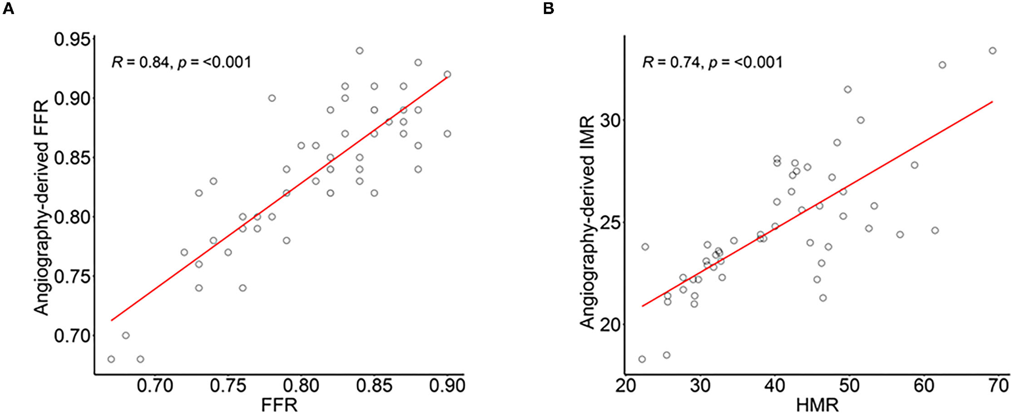 Correlation of angiography-derived FFR with invasive FFR and angiography-derived IMR and HMR in diagnostic cohort. The correlation and agreement between (A) angio-FFR and pressure wire–derived FFR, and (B) angio-IMR and coronary pressure and myocardial blood flow calculated HMR. Abbreviations are listed in Figures 1, 2.