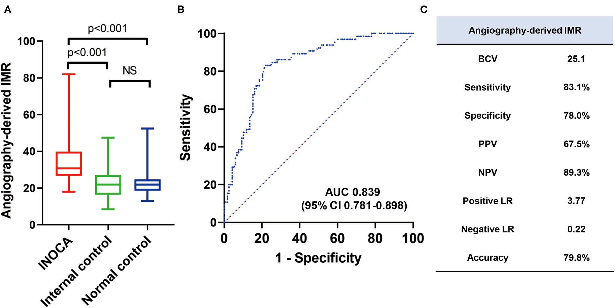 The angio-IMR in vessels with abnormal corresponding perfusion territory in INOCA patients was significantly higher than that in the normal corresponding perfusion territory (35.8 ± 13.3 vs. 22.0 ± 7.8, p < 0.001) in INOCA patients, as well as that in normal controls (35.8 ± 13.3 vs. 23.2 ± 7.3, p < 0.001). ROC analysis demonstrated that angio-IMR had a cut-off value of 25.1 to predict patients with microcirculatory dysfunction represented by normal coronary angiogram but abnormal CZT-SPECT perfusion imaging and showed an AUC of 0.839 (95% CI 0.781–0.898). Sensitivity, specificity, positive predictive value, negative predictive value, and the diagnostic accuracy of angio-IMR were 83.1, 78.0, 67.5, 89.3, and 79.8%, respectively (Figure 4).