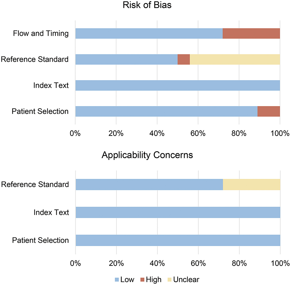 Risk of bias summary for included studies. The methodological quality of included studies was assessed with the revised Quality Assessment of Diagnostic Accuracy Studies (QUADAS-2) tool. This tool comprises four domains: patient selection, index test, reference standard, and flow and timing. Each domain is assessed in terms of risk of bias, and the first three domains are also assessed in terms of concerns regarding applicability.