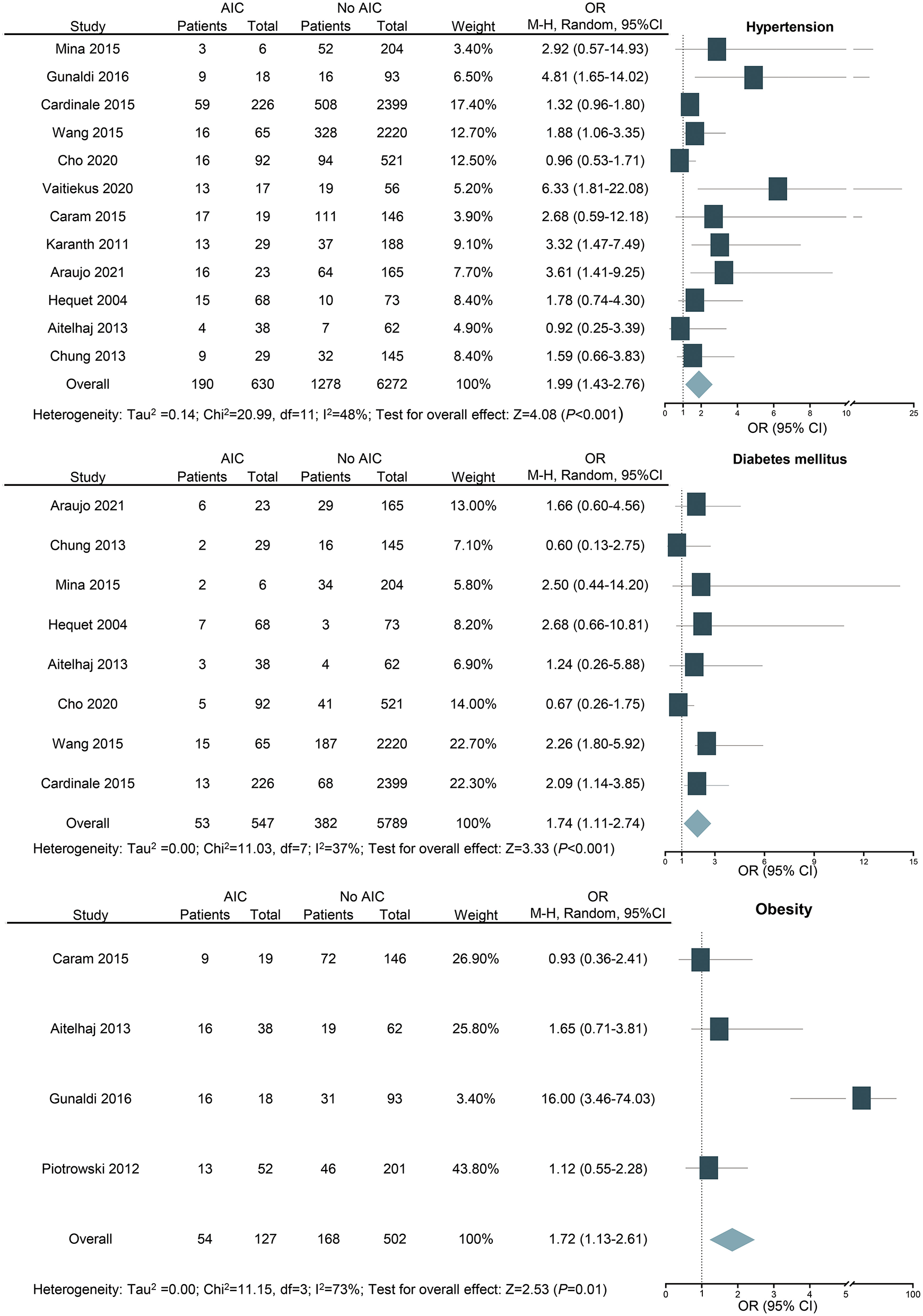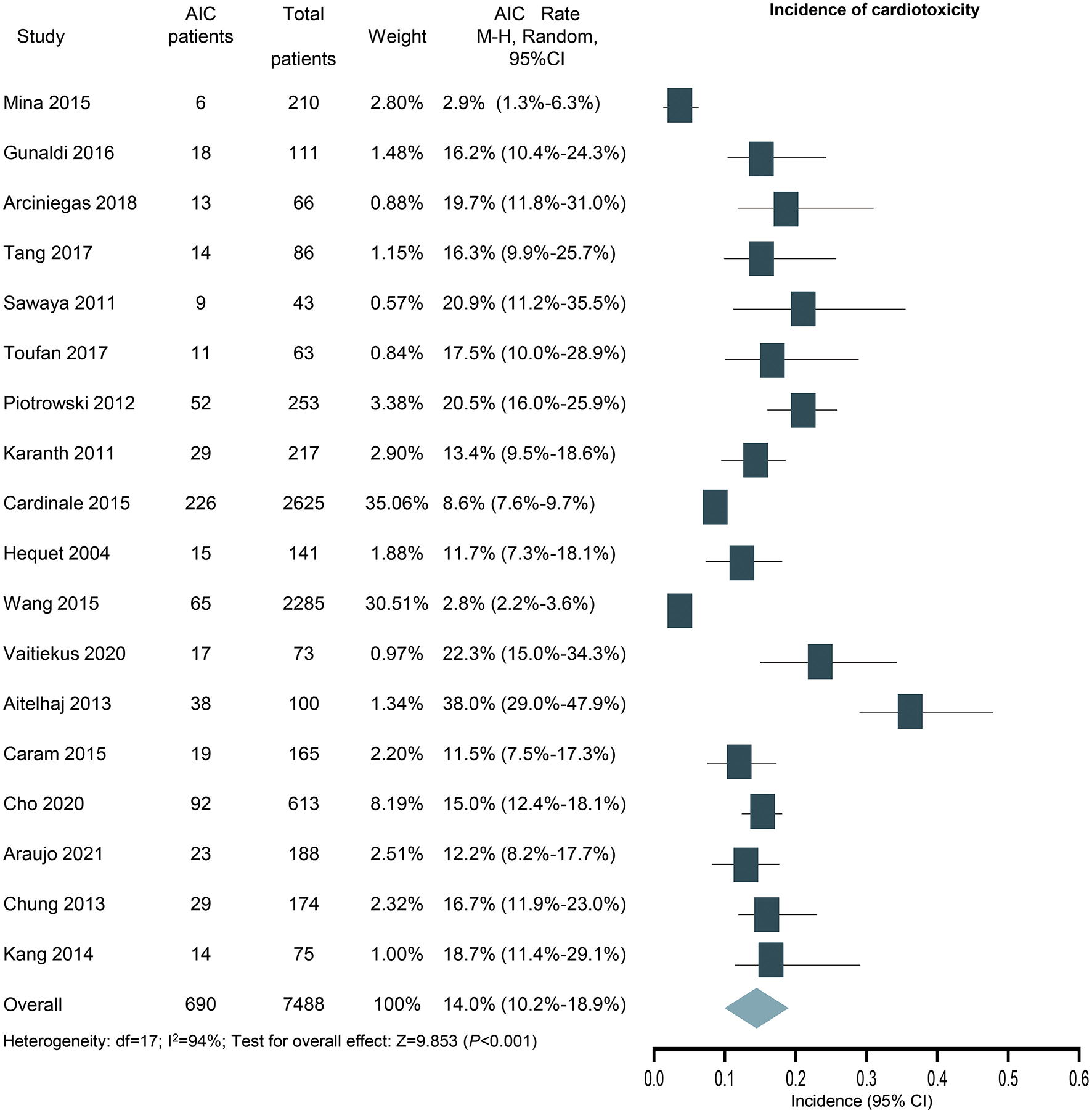 The summary incidence of AIC was calculated from the number of patients receiving chemotherapy based on anthracycline in retrospective cohort studies, case–control study, and clinical randomized controlled trials. In order to calculate the odds ratio (OR) and 95% confidence interval (CI) of each risk factor, data on the number of patients with various risk factors in the cardiotoxicity group and the non-cardiotoxicity group were extracted.