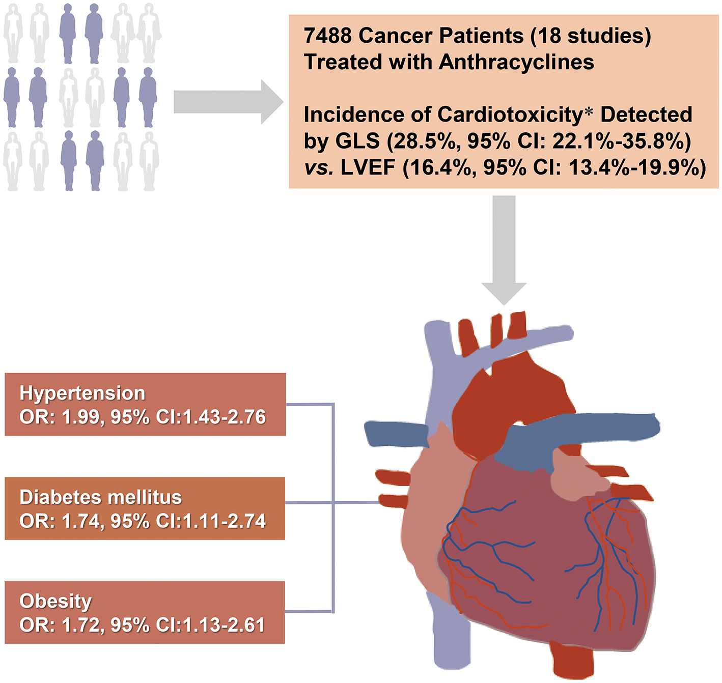 Central illustration: Risk factors for anthracycline-induced cardiotoxicity. The present systematic review included 18 studies of 7,488 cancer patients receiving anthracycline chemotherapy. Hypertension, diabetes, and obesity were identified as risk factors for anthracycline-induced cardiotoxicity. GLS showed higher detection rate and better early detection ability for cardiotoxicity than LVEF. *6 of the 18 studies used both LVEF and GLS. CI, confidential interval; LVEF, left ventricular ejection fraction; GLS, global longitudinal strain.