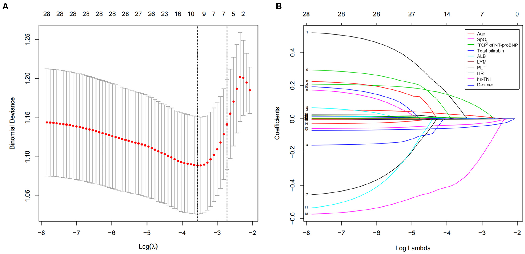 Clinical feature selection using a least absolute shrinkage and selection operator (LASSO) binary logistic regression model. (A) Selection of optimal parameters (lambda) from the LASSO model using 10-fold cross-validation and minimum criteria. The partial likelihood deviance (binomial deviance) curve was plotted vs. log (lambda). Dotted vertical lines were drawn at the optimal values using the minimum criteria and the 1 standard error of the minimum criteria (1-SE criteria). (B) LASSO coefficient profiles of the 28 texture features. A vertical line was drawn at the value selected using 10-fold cross-validation, where optimal l resulted in nine non-zero coefficients. LASSO, least absolute shrinkage and selection operator; hs-cTNI, higher sensitivity cardiac troponin I; “TCP” of NT-proBNP, “triple cut-point” strategy of NT-proBNP; SpO2, blood oxygen; HR, heart rate.