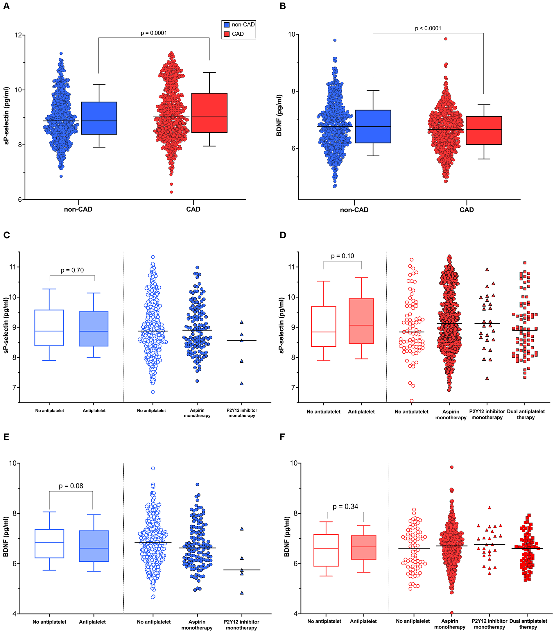 Distribution of sP-selectin levels and BDNF concentrations. (A) sP-selectin and (B) BDNF levels in CAD group (n = 673) and non-CAD group (n = 607). (C,D) sP-selectin and (E,F) BDNF levels distributed among users and non-users of antiplatelet therapy. The lines represent the median value; the box marks the 75th and the 25th percentiles; and whiskers indicate the 90th and 10th percentiles. An independent t-test was used to test for significant log-transformed sP-selectin and BDNF levels difference.