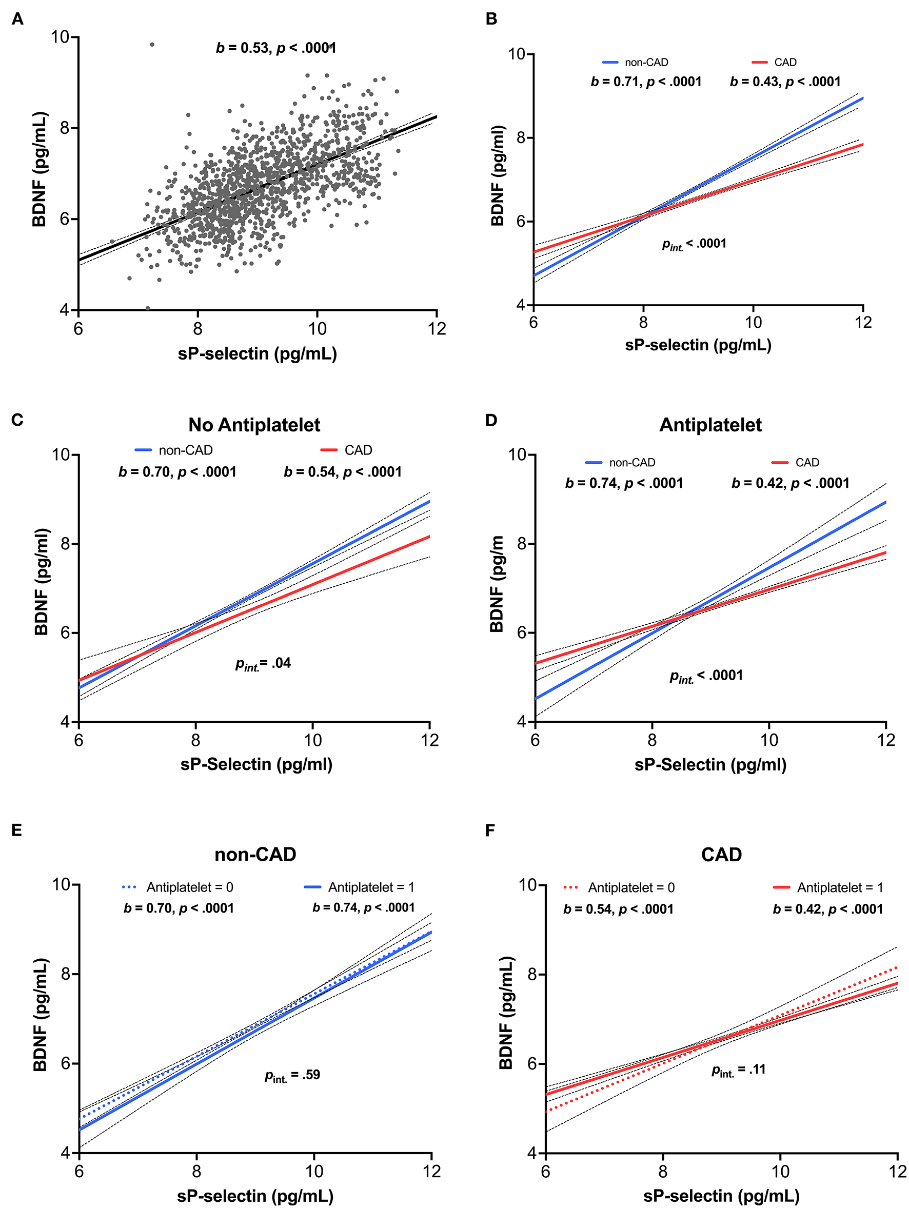 Relationship between platelet activity and BDNF concentrations. (A) Association of sP-selectin to BDNF concentrations in the overall population (n = 1,280). (B) Interaction with CAD status. Association of sP-selectin to BDNF concentrations in subjects (C) without and (D) with antiplatelet therapy. (E,F) Interaction with antiplatelet medication. sP-selectin and BDNF concentrations were log-transformed to account for a skewed distribution. b: unstandardized coefficient.