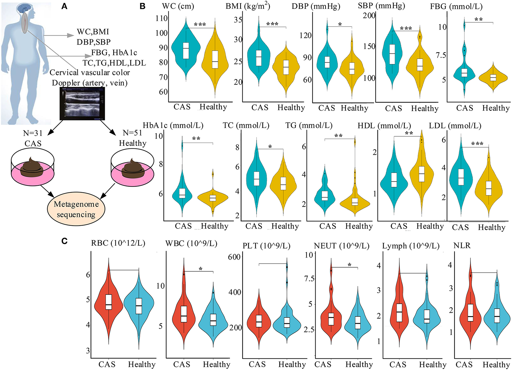 Study design and characteristics of the clinical parameters. (A) Study design including the cross-sectional cohort. (B) Comparisons of risk factors between the CAS and healthy control groups. (C) Comparisons of inflammatory markers between the CAS and healthy control groups. *, **, and *** denote p < 0.05, p < 0.01, and p < 0.001 compared with healthy controls, respectively. CAS, carotid arteriosclerosis; WC, waist circumference; BMI, body mass index; DBP, diastolic blood pressure; SBP, systolic blood pressure; FBG, fasting blood glucose; HbA1c, glycated hemoglobin A1c; TC, total cholesterol; TG, triglyceride; HDL-C, high-density lipoprotein cholesterol; LDL-C, low-density lipoprotein cholesterol; SUA, serum uric acid; RBC, red blood cell; WBC, white blood cell; PLT, platelets; NEUT, absolute value of neutrophils; Lymph, absolute value of lymphocytes; NLR, neutrophil-to-lymphocyte ratio.