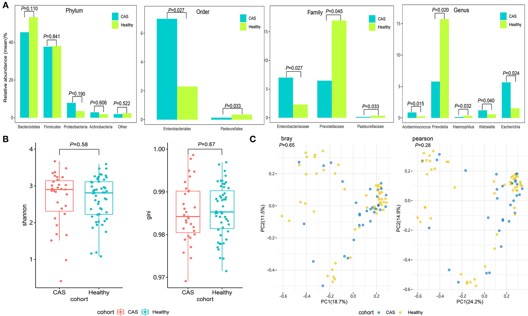 As presented in Figure 2A, the gut microbiota in the CAS and control groups was dominated by four abundant phyla with no significant differences between the groups. However, the abundance of Enterobacteriales and Pasteurellales at the order level; Enterobacteriaceae, Prevotellaceae, and Pasteurellaceae at the family level; and Acidaminococcus, Escherichia, Haemophilus, Klebsiella, and Prevotella at the genus level was significantly different between the groups. The abundance of Prevotellaceae, Pasteurellaceae, Haemophilus, and Prevotella was significantly higher in the CAS group (Supplementary Table 1). In addition, the microbiomes of patients in the CAS group at the species level had no significant differences concerning alpha diversity as determined by the Shannon and Gini indices compared with the healthy controls (Wilcoxon's rank-sum test, p = 0.58 and p = 0.67, respectively; Figure 2B). Similarly, the microbiomes of patients in the CAS group did not differ from those of healthy subjects regarding beta diversity as determined by the Bray and Pearson distances (Wilcoxon's rank-sum test, p = 0.65 and p = 0.28, respectively; Figure 2C).