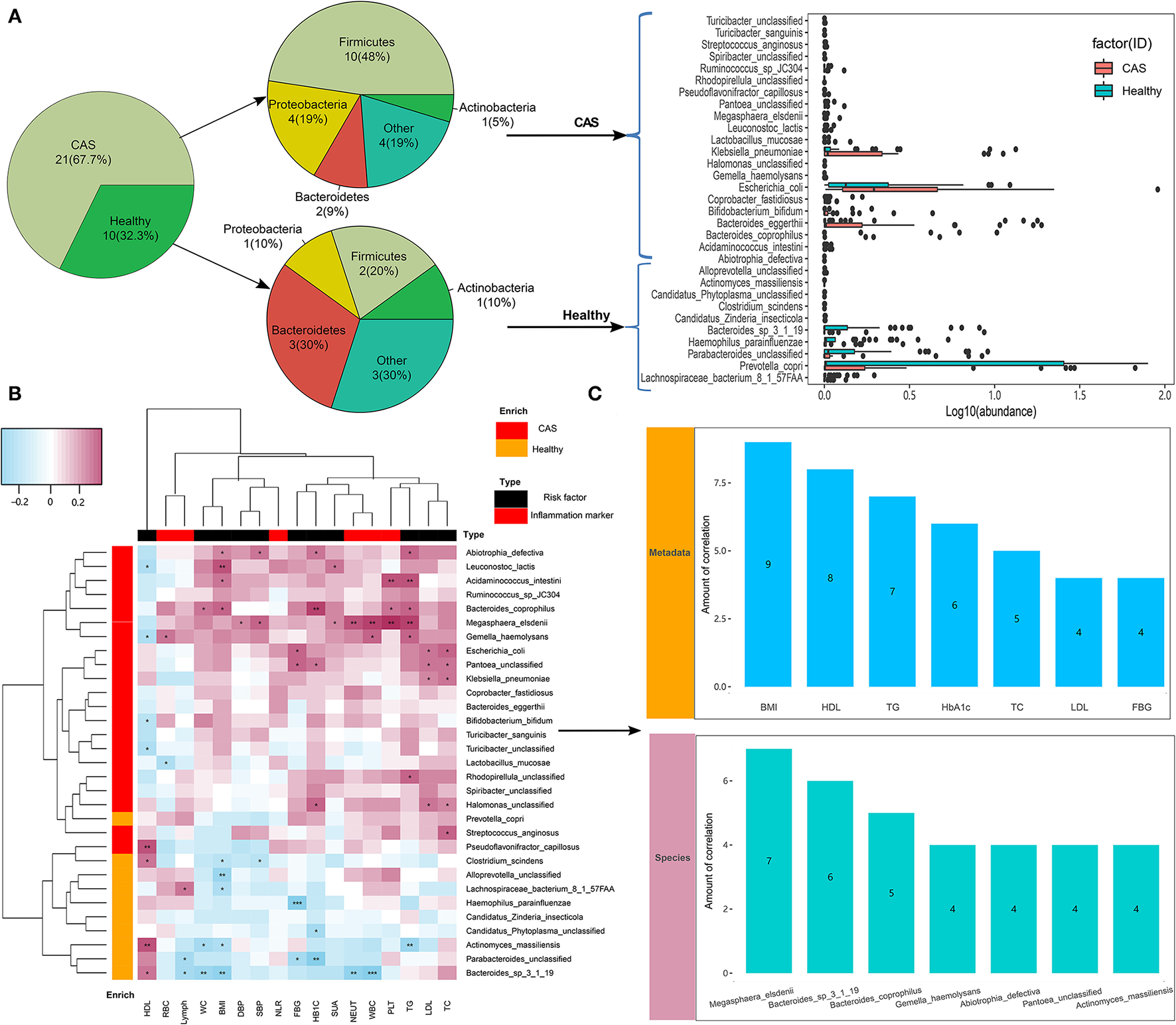 Microbiome differences between the groups and the associations with clinical characteristics. (A) Species with differences in abundance between the carotid arteriosclerosis (CAS) and healthy control groups. (B) Correlation matrix for species and clinical parameters. Pink cells denote positive correlations, whereas blue cells depict negative correlations. *, **, and *** denote p < 0.05, p < 0.01, and p < 0.001, respectively. (C) The number of significant correlations for the seven risk factors and seven species with the most frequent correlations.