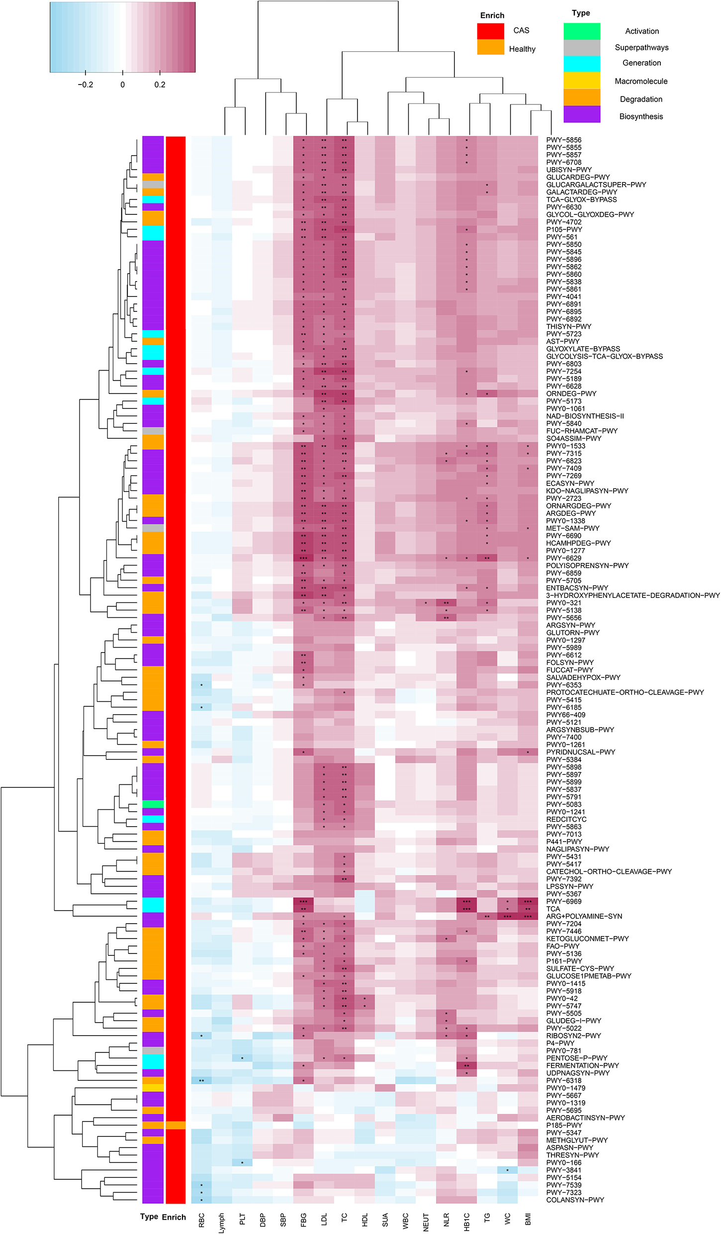 We further used the MetaCyc pathway database from HUMAnN2 to construct the functional profiles with 494 pathways for each sample. We compared differences inpathway abundance and identified 145 different pathways (Wilcoxon's rank-sum test; p < 0.05). After removing the pathways with low occurrence and abundance, 143 pathways with significantly different abundance remained (Supplementary Table 4, Figure 4). In total, 142 pathways were enriched in the CAS group, whereas only one pathway was enriched in the control group. The pathway enriched in healthy controls was formaldehyde assimilation III (P185-PWY, metabolism to 3-phospho-D-glycerate), in which formaldehyde is a central metabolite in the generation of TMAO from TMA (PWY-6968, trimethylamine degradation).
