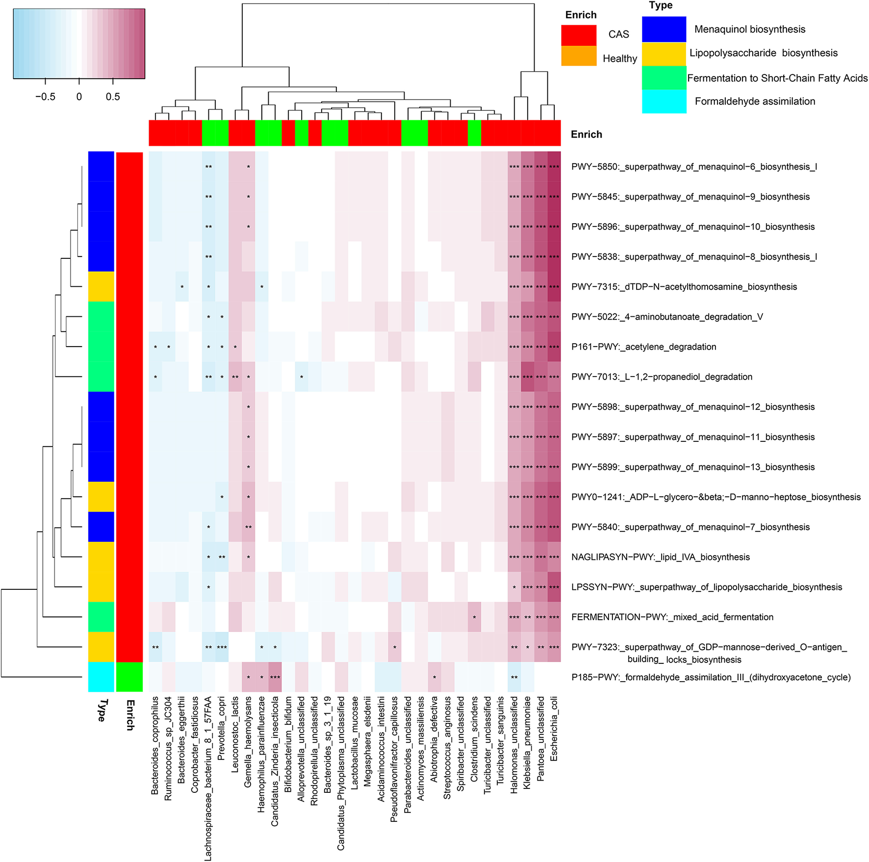Spearman's correlation matrix for microbial pathways and species. The cell color indicates the correlation type (pink: positive, blue: negative). *, **, and ***denote p < 0.05, p < 0.01, and p < 0.001, respectively.