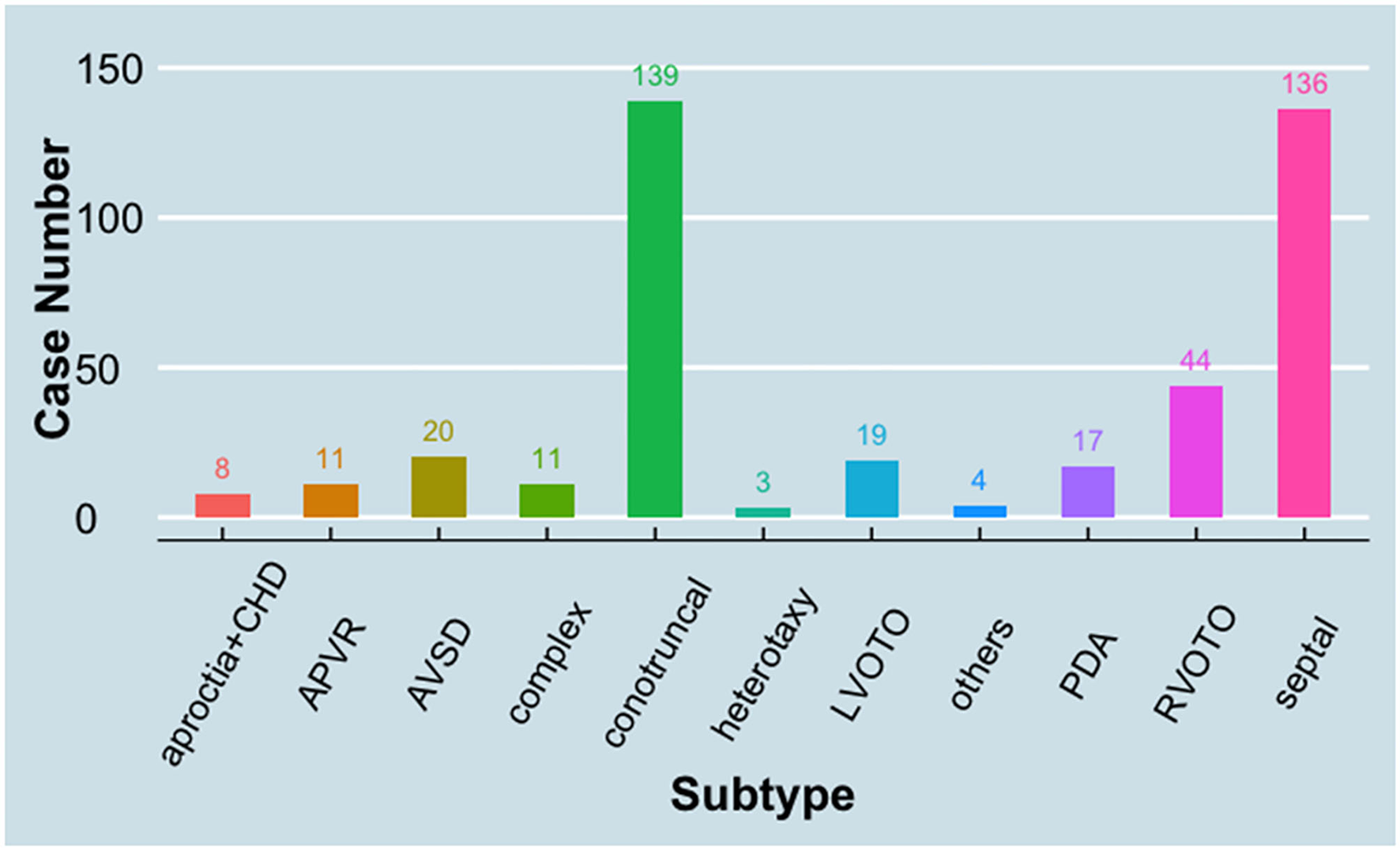 Distribution of case subtypes in the study. APVR, anomalous pulmonary venous return; AVSD, atrioventricular septal defect; CHD, congenital heart defect; LVOTO, left ventricular outflow tract obstruction; PDA, patent ductus arteriosus; RVOTO, right ventricular outflow tract obstruction.