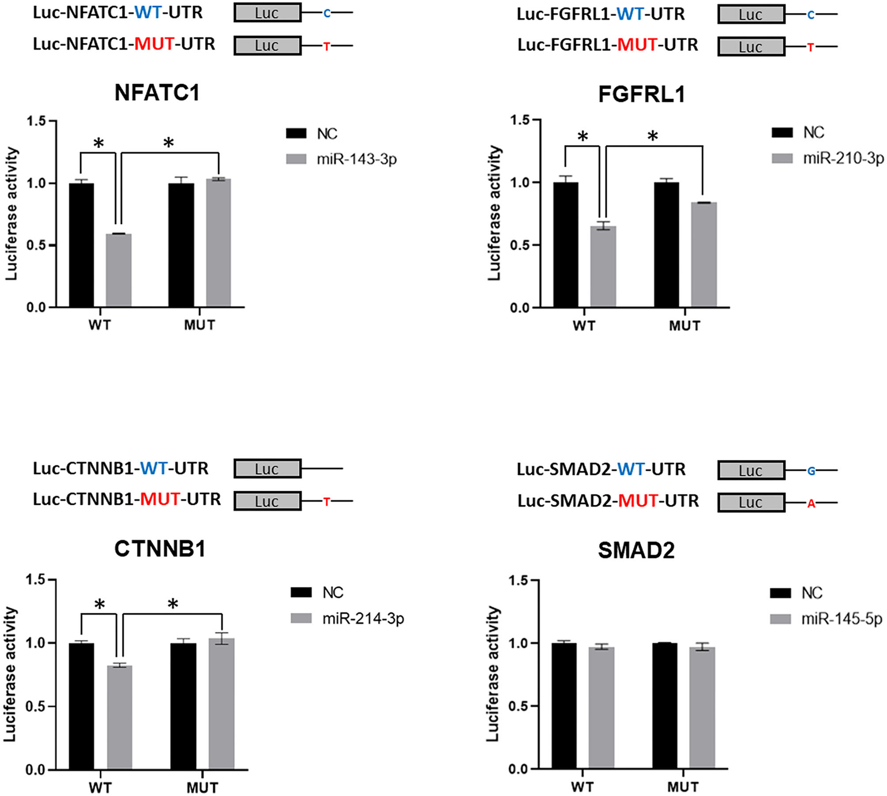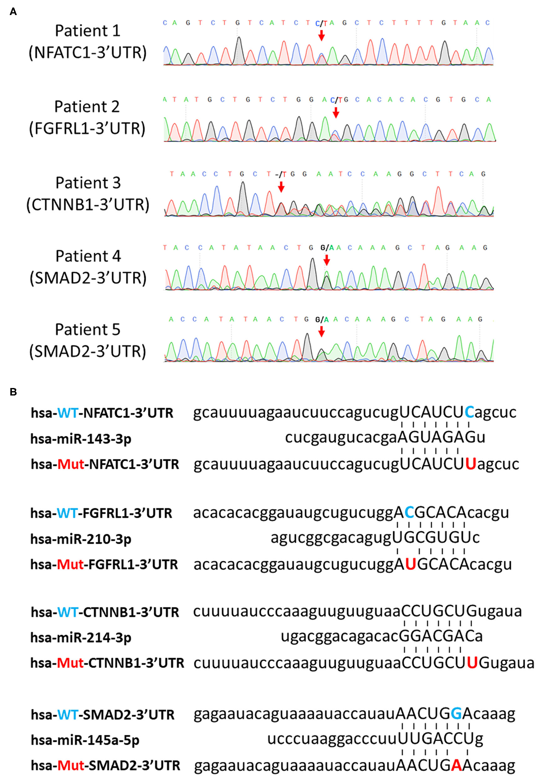 HEK293T cells were cultured in Dulbecco's modified essential medium (DMEM) supplemented with 10% fetal bovine serum (FBS) in a 5% CO2 atmosphere at 37°C. For construction of the 3′UTR-luciferase reporter, the multiple cloning site of the pGL3-Control vector (Promega) was removed and placed downstream of the luciferase gene. Short 3′UTR fragments of human NFATC1, FGFRL1, CTNNB1, and SMAD2 genes containing predicted miRNA binding sites were cloned into the modified pGL3-Control vector, resulting in the constructs Luc-NFATC1-WT-UTR, Luc-FGFRL1-WT-UTR, Luc-CTNNB1-WT-UTR, and Luc-SMAD2-WT-UTR. Similarly, mutant 3′UTR fragments harboring SNVs detected in patients were cloned into the modified pGL3-Control vector, resulting in mutant constructs. Luciferase reporter, Renilla control luciferase reporter, and miRNA mimic were transfected into HEK293T cells with Lipofectamine (Invitrogen) reagents according to manufacturers' instruction. Twenty-four hours after transfection, cell extracts were prepared, and luciferase activity was determined with dual luciferase assay kit (Promega). For luciferase assay, normalized Firefly luciferase activity from triplicate samples in 12-well plates relative to Renilla luciferase activity was calculated.