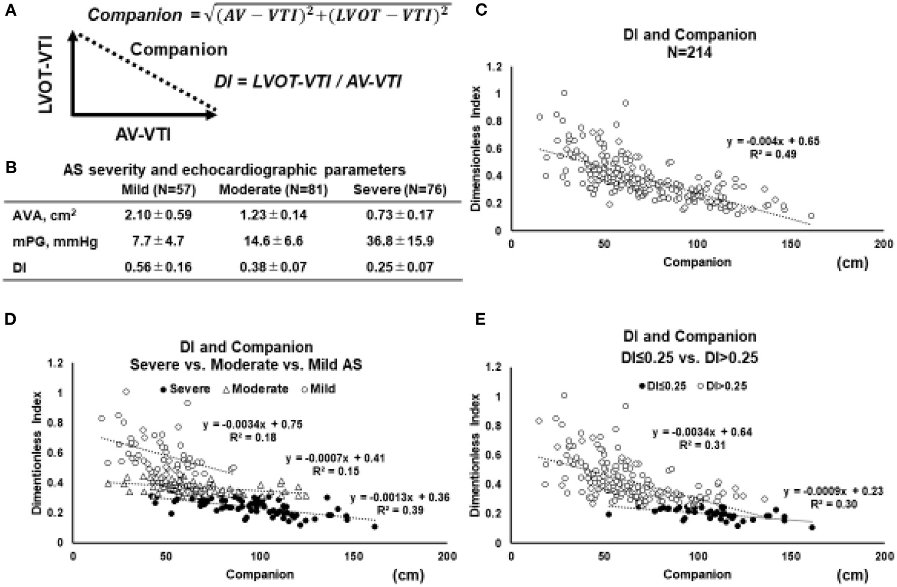 Figure 2. Relation between DI and its companion. (A) Geometric relationship between the two parameters and the companion. Based on Pythagorean theorem, the companion (diagonal length of the triangle) is obtained by the following equation: Companion = √(AV − VTI)2 + (LVOT − VTI)2. (B) In order to elucidate the behavior of the relation between DI and companion, the echocardiographic parameters in 214 patients with AS are retrospectively reviewed. (C) The relations between the DI and companion in whole AS patients (N = 214). (D) The relation between the DI and companion in separated by the severity of AS (mild vs. moderate vs. severe). (E) The relation between the DI and companion in AS patients with DI ≤ 0.25 vs. DI > 0.25 (E). Abbreviations are as same as in Figure 1.