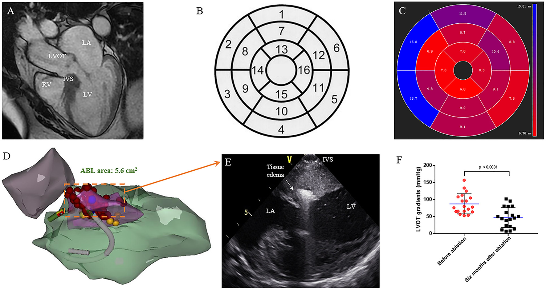 Interventricular septal ablation in patients with HOCM. (A) CMR end-diastolic long-axis image demonstrates a significant hypertrophy in basal septum. (B) Display of the 16 myocardial segments on a circumferential polar plot. The recommended nomenclature for tomographic imaging of the heart: 1. Basal anterior, 2. Basal anteroseptal, 3. Basal inferoseptal, 4. Basal inferior, 5. Basal inferolateral, 6. Basal anterolateral, 7. Mid anterior, 8. Mid anteroseptal, 9. Mid inferoseptal, 10. Mid inferior, 11. Mid inferolateral, 12. Mid anterolateral, 13. Apical anterior, 14. Apical septal, 15. Apical inferior, 16. Apical lateral. (C) The circumferential polar plot presents a limited hypertrophy in basal anteroseptal and inferoseptal segments. The number indicates the average thickness of each segment. (D) Right anterior oblique (RAO) projection of the CARTO shell. Left ventricular (green), aorta (purple), SAM area of hypertrophic septum (pink), and left bundle branch (yellow) are presented. Ablation is performed on SAM area (red). (E) On the live ICE screen, significant tissue edema can be observed after ablation. (F) Reduction of obstruction at rest is seen on continuous-wave Doppler echocardiography. The LVOT gradient (in mmHg) is significantly decreased after 6 months follow up. (P = 0.001) LA, left atrium; LV, left ventricle; LVOT, left ventricular outflow tract; RV, right ventricle; IVS, interventricular septum.