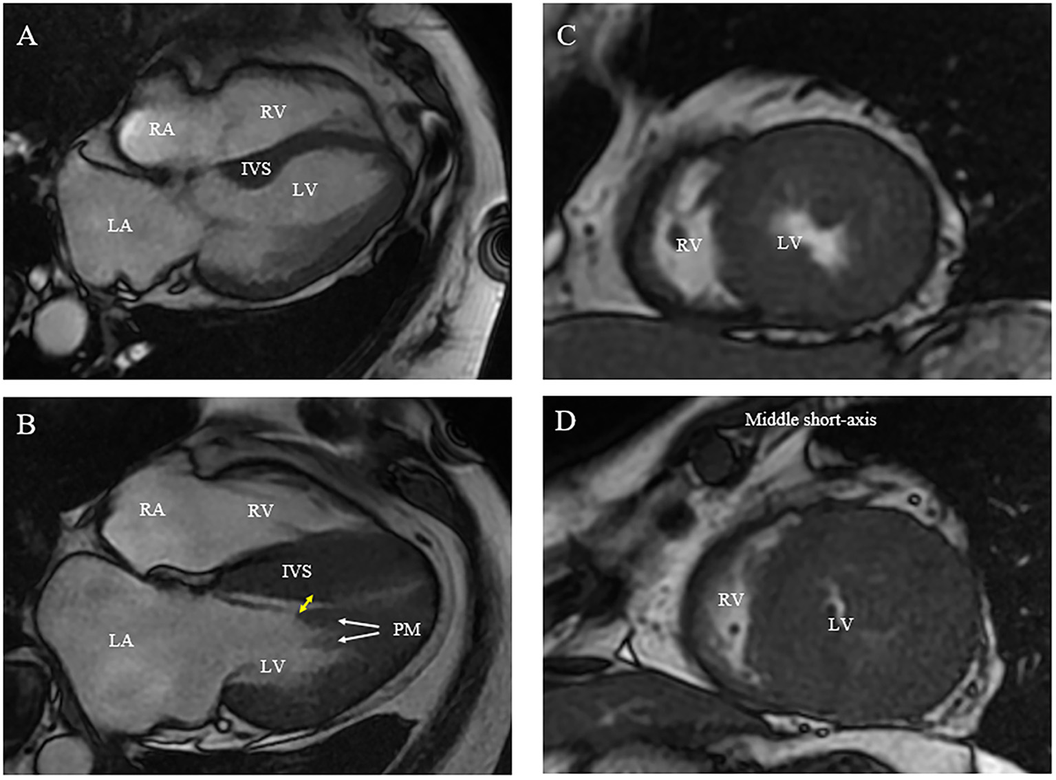 The distribution of hypertrophied segments in septum and hypertrophied and displacement PM was measured in CMR. The distribution of hypertrophied segments in septum is recorded according to the nomenclature for tomographic imaging of the heart (Figure 1B).