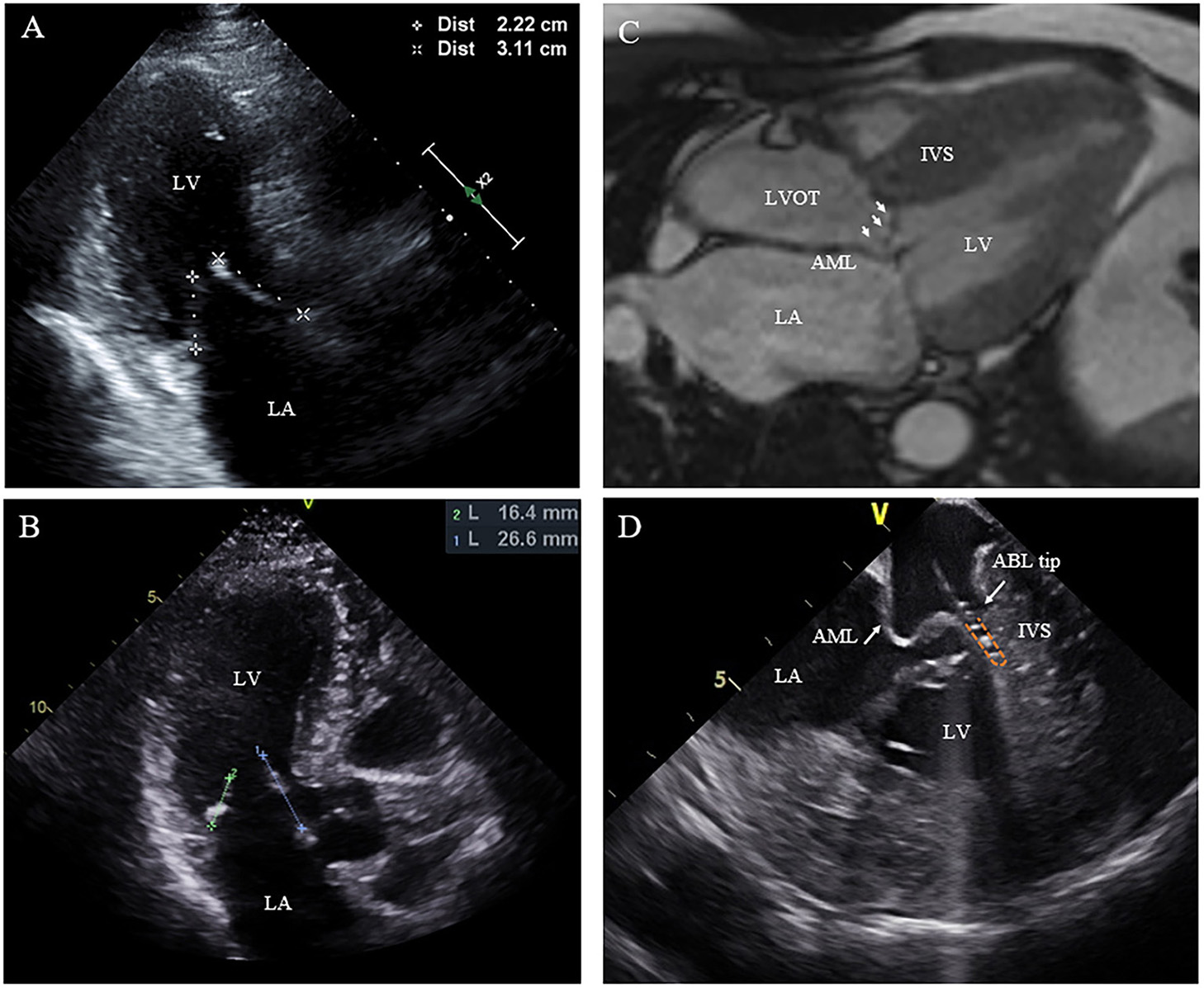 Morphologic abnormalities of mitral valve contributing to outflow tract obstruction. (A,B) The length of the AML was measured by echocardiography in diastole on the apical three-chamber view. (C) Extraordinarily long anterior mitral valve leaflet on CMR. (D) On live ICE screen, the AML (white arrow) is reflexed and attached to IVS during systole and pats on the ablation catheter tip during procedure. AML, anterior mitral leaflet.