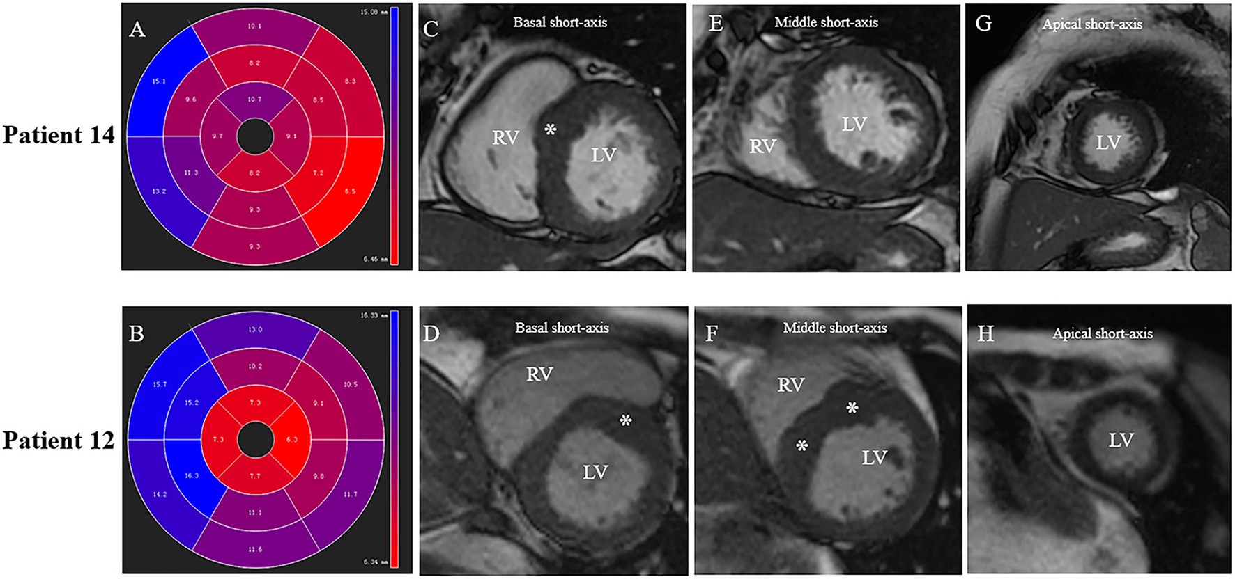 Different patterns of septum hypertrophy among patients. Patient No.12: (B,D,F,H). Patient No.14: (A,C,E,G). (A,B) CMR end-diastolic images demonstrating different patterns of interventricular septum hypertrophy. The distribution of LV hypertrophy is limited (basal anteroseptal segment) in (A), while diffused (basal, mid anteroseptal, and mid inferoseptal segments) in (B). (C,D) Short-axis view presents a segmental LV hypertrophy of the basal anterior septum in both patients. (E,F) Both mid anteroseptal and inferoseptal segments are free of hypertrophy in (E), but present hypertrophied phenotype in (F). (G,H) Apical septal segment is free of hypertrophy in both patients.