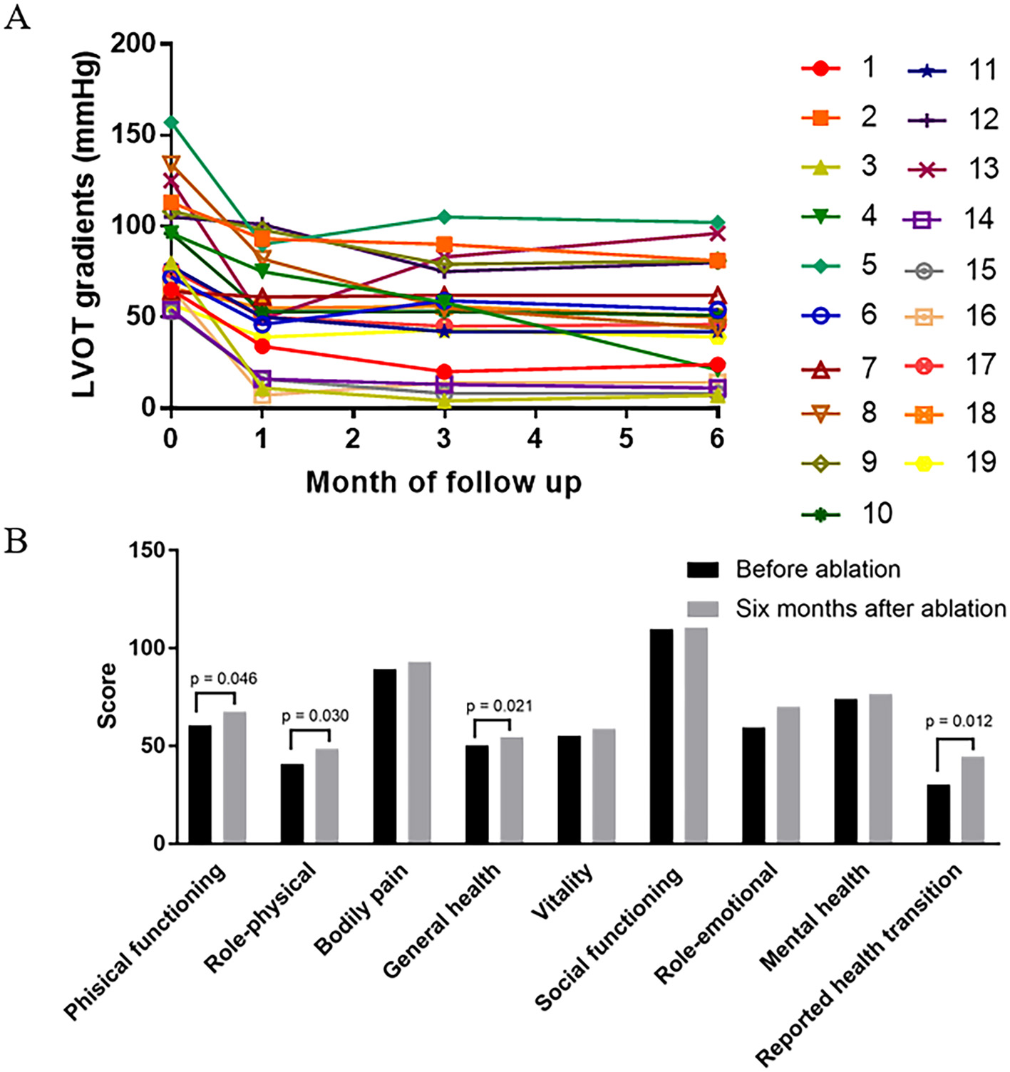 The change of hemodynamic and health-related quality of life after 6 months follow up. (A) LVOT gradient is shown (in mmHg) before, 1 month after, 3 months after, and 6 months after LV septal radiofrequency ablation. Reduction of gradient is significant after 6 months follow up (p < 0.001) especially in patient 3, 4, 8, 14, 15, and 16. (B) Comparison of health-related quality of life before and 6 months after ablation procedure. The score of four dimensions (physical functioning, role-physical, general health, and reported health transition) are increased after 6 months follow up.