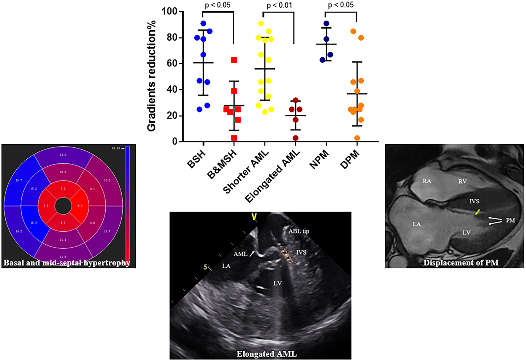 The reduction of gradient was greater in patients with limited basal septal hypertrophy (the septal hypertrophy is limited in basal segments; 60.9 ± 8.3 vs. 27.9 ± 7.1 mm, p = 0.01) and shorter AML (56.1 ± 6.4 vs. 20.4 ± 5.0 mm, p < 0.01). For patients with DPM, the reduction of gradient was lower than others (36.9 ± 7.1 vs. 75.0 ± 6.3mm, p < 0.05) (Figure 6).