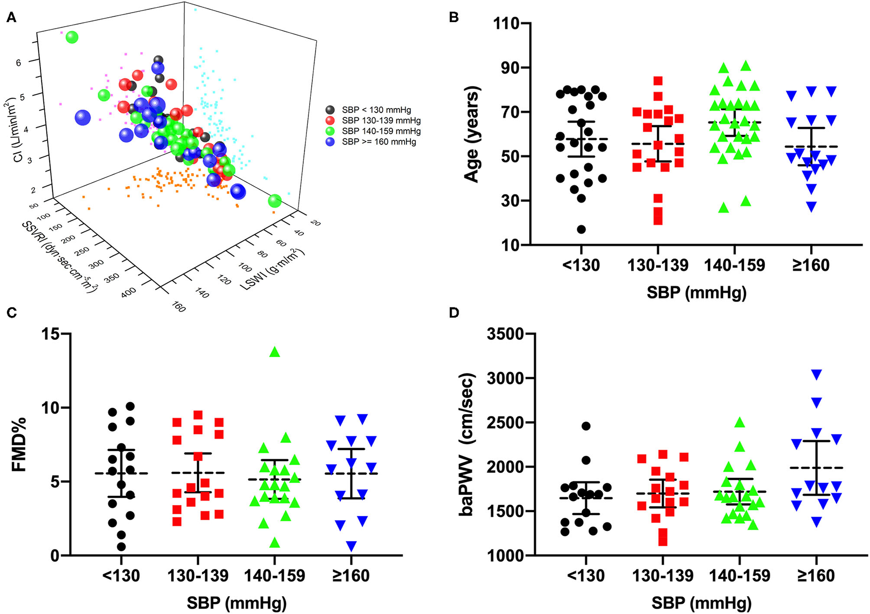 Distribution of hemodynamic components and vascular function of hypertension. (A) Three-dimension scatterplot of CI, SSVRI, and LSWI by SBP categories, in which bubble size represents mean arterial pressure level. (B–D) Distinct distribution discrepancies of age, FMD, and baPWV in different blood pressure stages. CI, cardiac index; SSVRI, stroke systemic vascular resistance index; LSWI, left stroke work index; SBP, systolic blood pressure; FMD%, flow-mediated dilation percentage of baseline diameter; baPWV, brachial-ankle pulse wave velocity.
